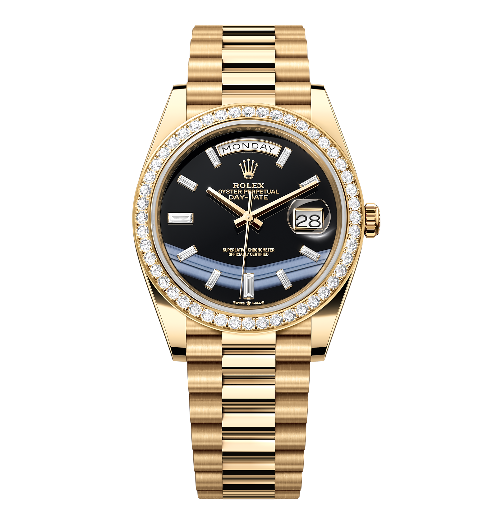 Rolex Day-Date – 40 mm – זהב צהוב לוח שחור יהלומים באזל יהלומים גימור קצה