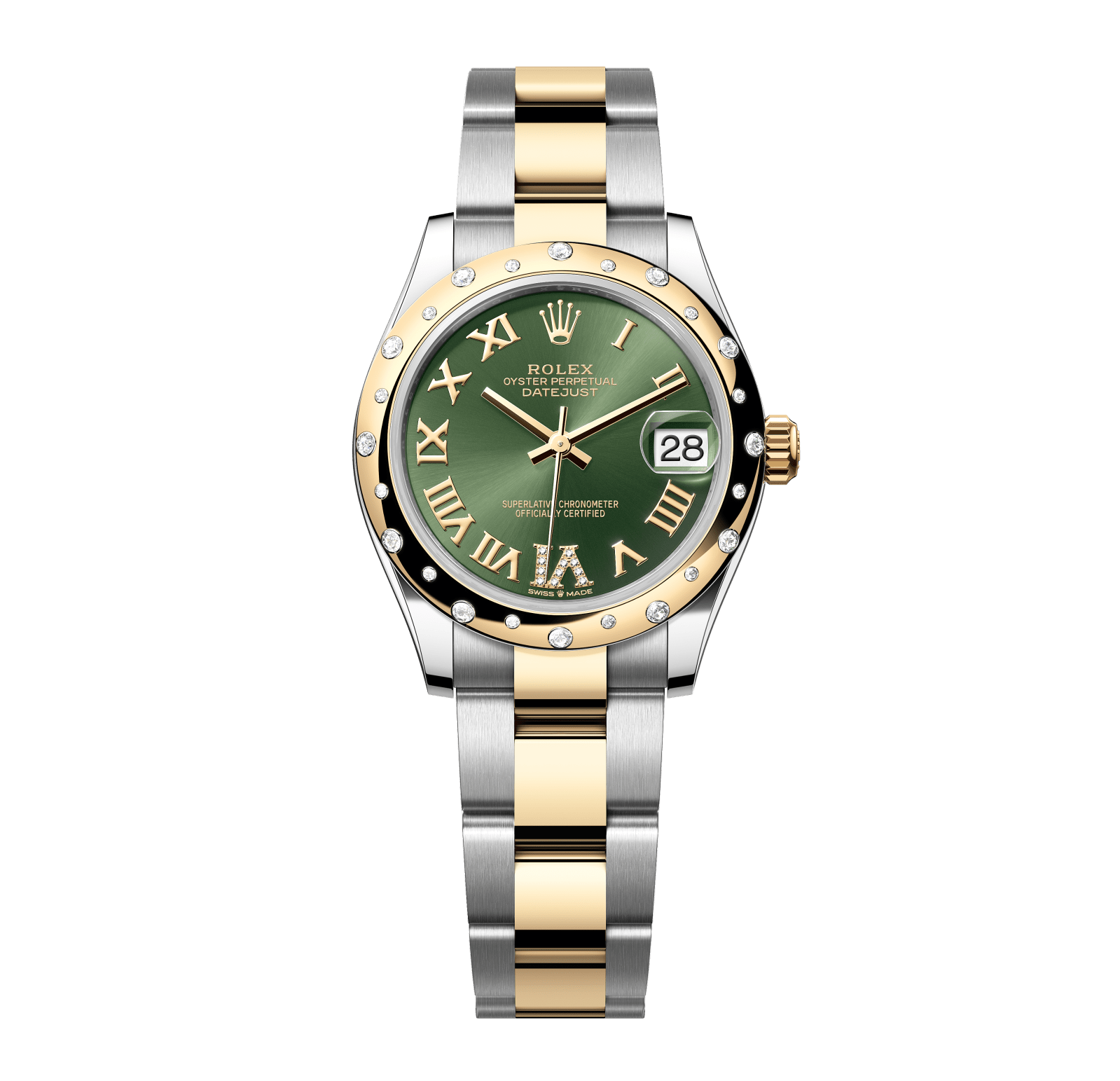 Rolex Datejust – 31 mm – טו טון זהב צהוב רצועת אויסטר באזל חלק לוח רומי ירוק גימור קצה