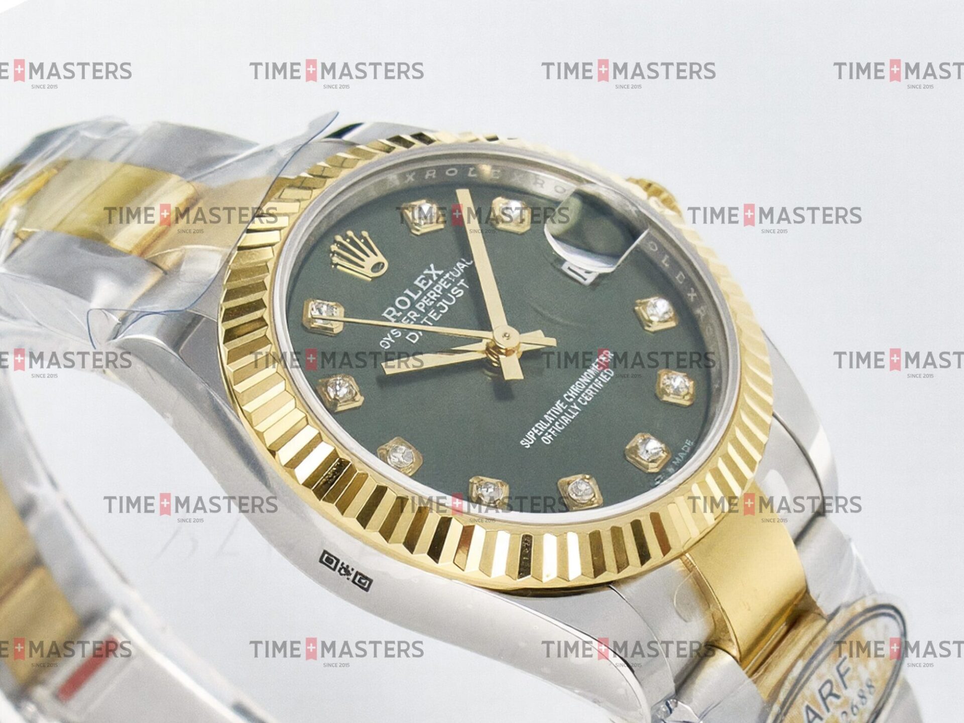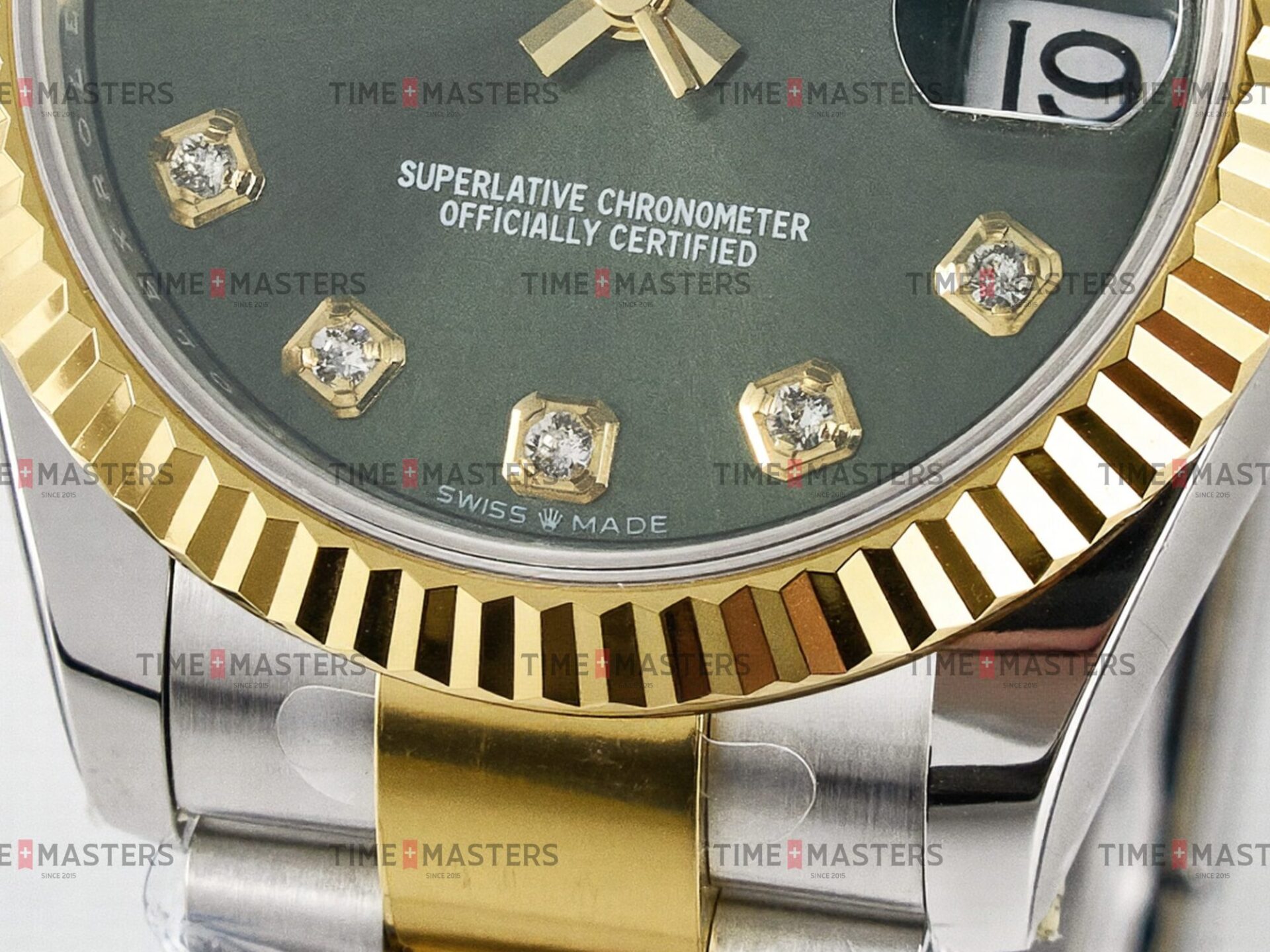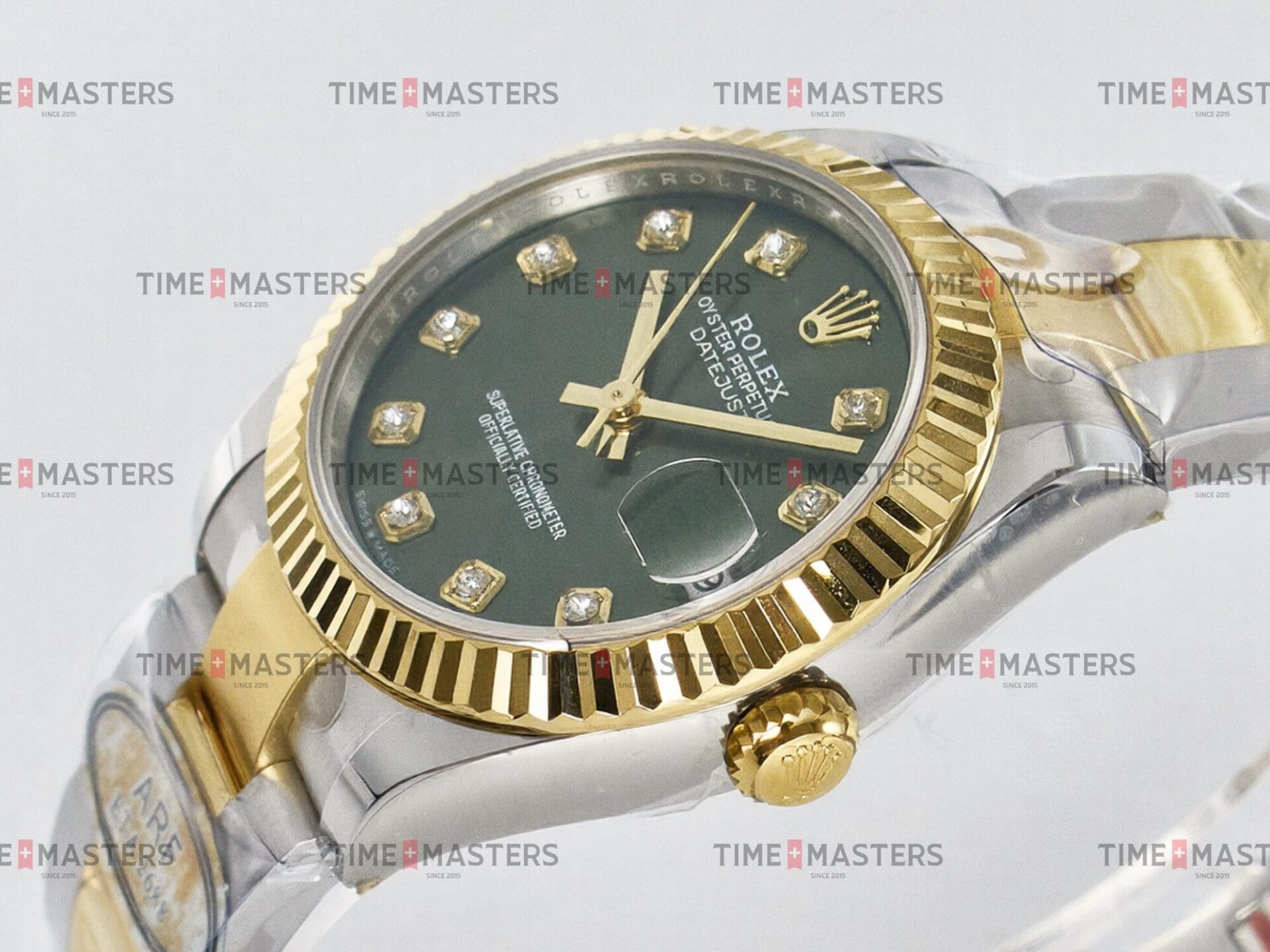 Rolex Datejust – 31 mm – טו טון זהב צהוב רצועת אויסטר באזל משונן לוח ירוק יהלומים גימור קצה