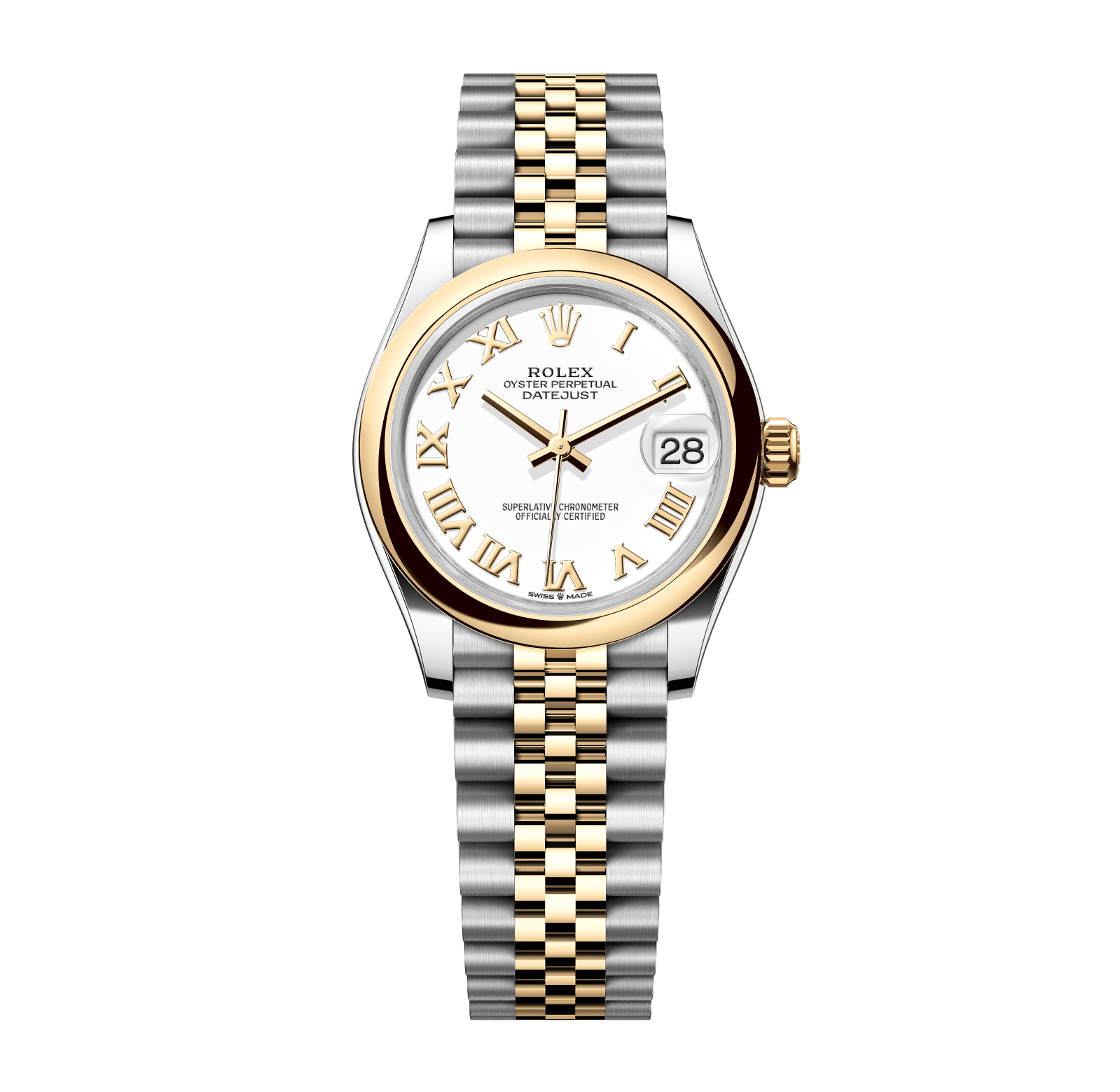 Rolex Datejust – 31 mm – טו טון זהב צהוב רצועת ג'ובילי באזל חלק לוח רומי לבן גימור קצה