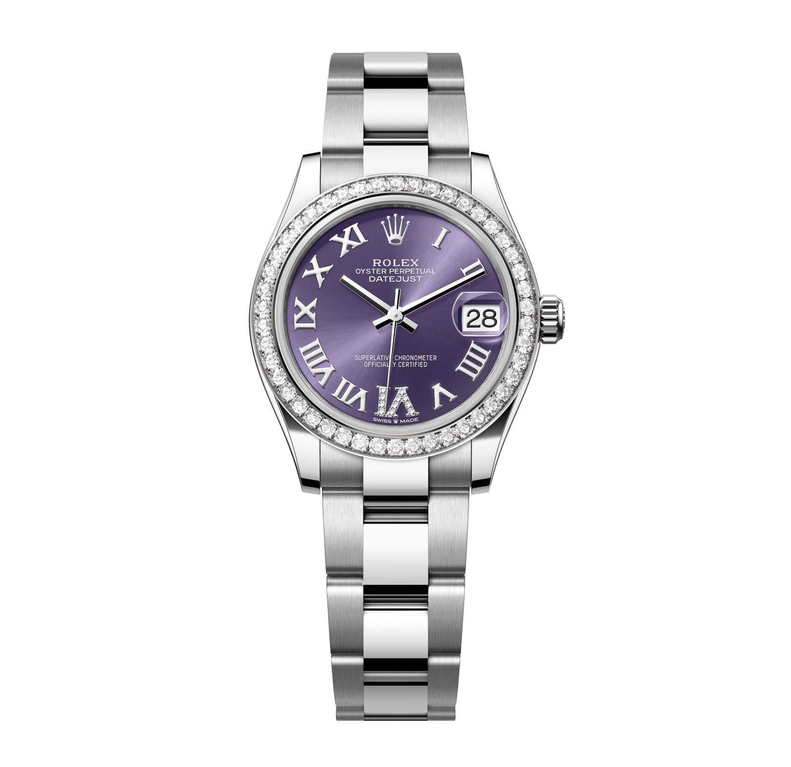 Rolex Datejust – 31 mm – פלדה רצועת אויסטר באזל יהלומים לוח רומי סגול גימור קצה