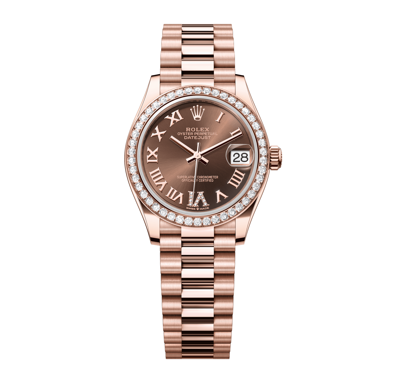 Rolex Datejust – 31 mm – רוז גולד רצועת ג'ובילי באזל יהלומים לוח רומי שוקולד גימור קצה