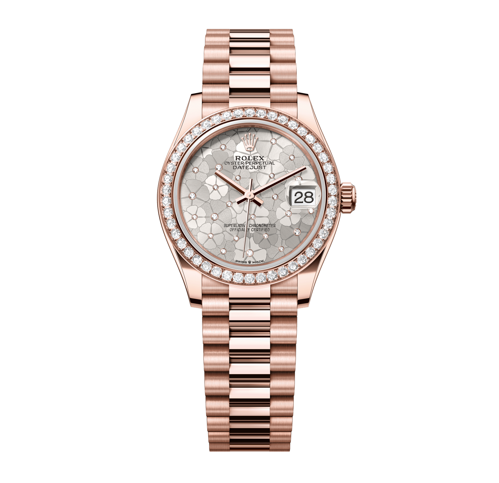 Rolex Datejust – 31 mm – רוז גולד רצועת ג'ובילי באזל יהלומים לוח מוטיף פלורל סילבר גימור שוויצרי