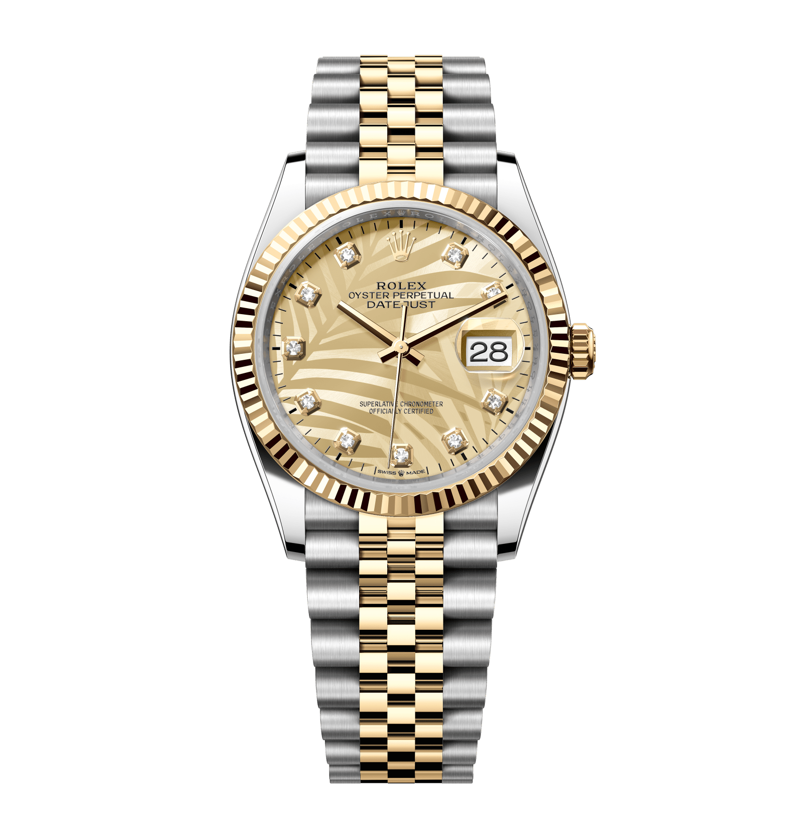 Rolex Datejust – 36 mm – טו טון זהב צהוב ג'ובילי באזל משונן לוח עלה דקל זהב יהלומים גימור קצה