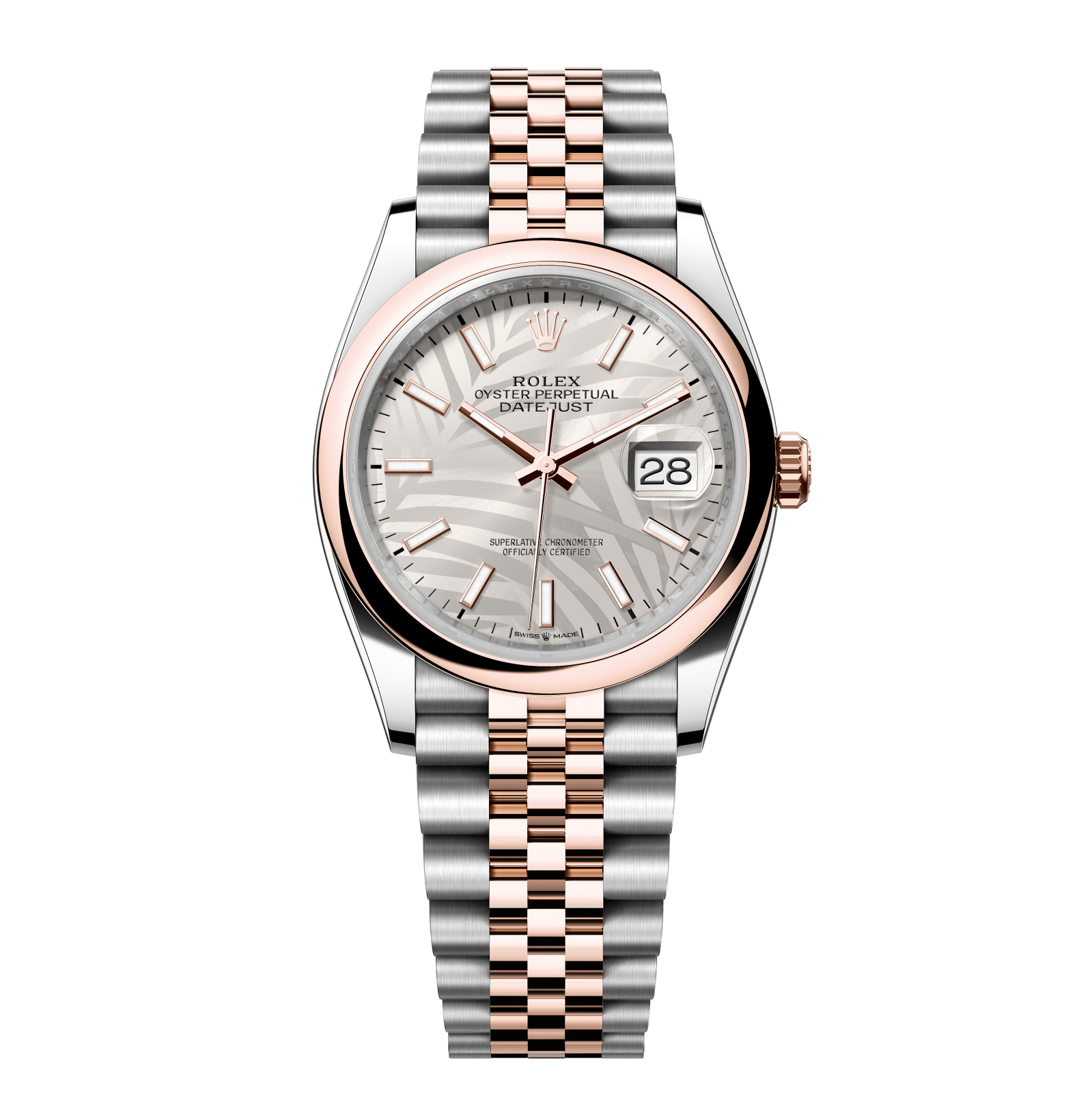 Rolex Datejust – 36 mm – טו טון רוז גולד רצועת ג'ובילי באזל חלק לוח עלה דקל סילבר גימור שוויצרי