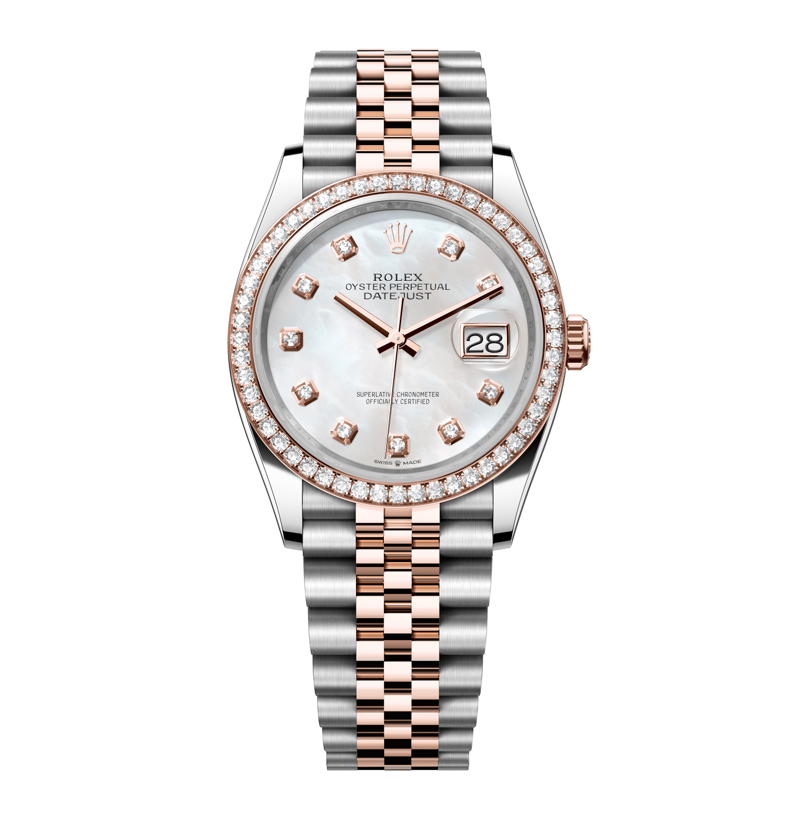 Rolex Datejust – 36 mm – טו טון רוז גולד רצועת ג'ובילי באזל יהלומים לוח סילבר יהלומים גימור שוויצרי