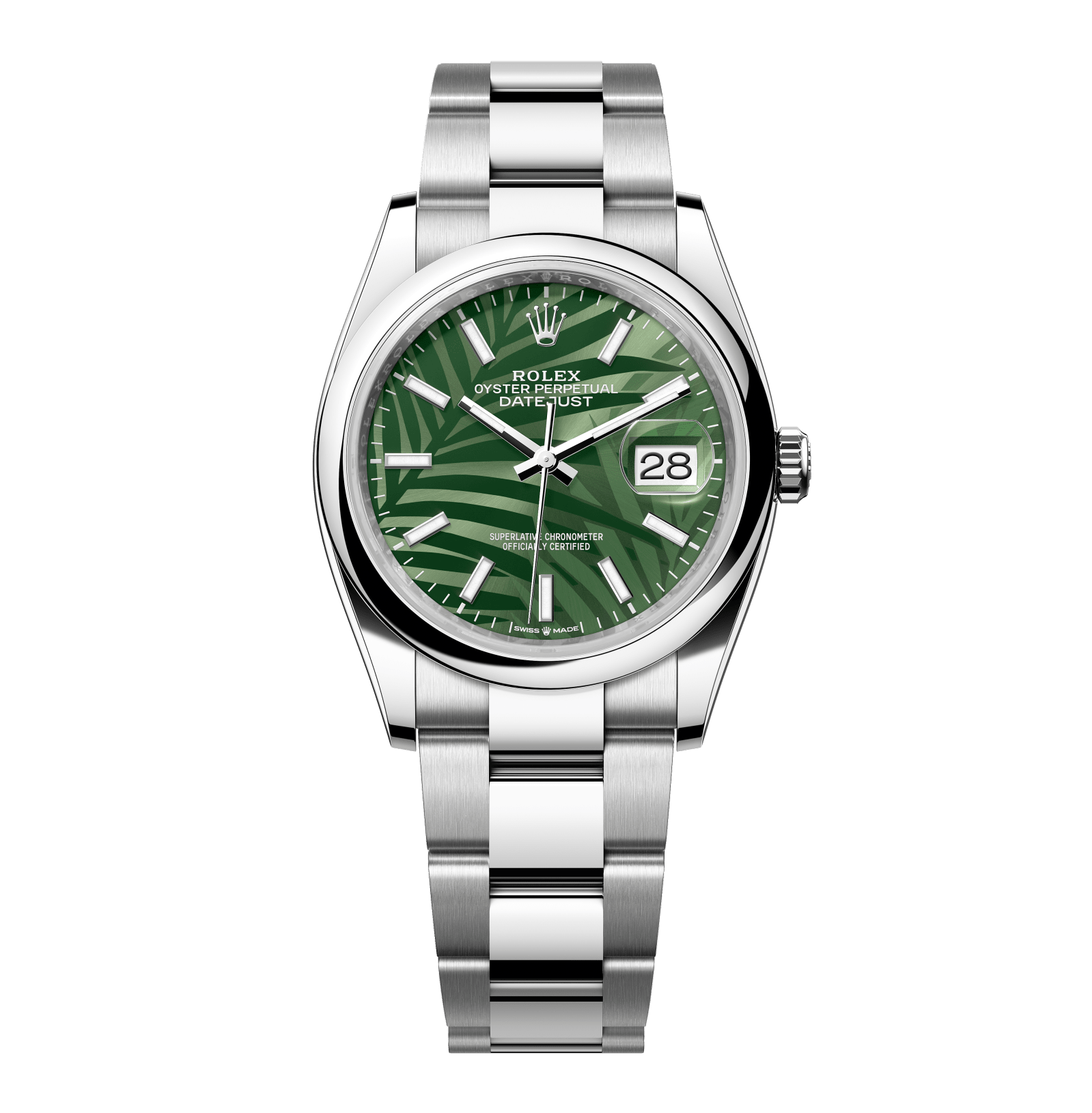Rolex Datejust – 36 mm – פלדה רצועת אויסטר באזל חלק לוח עלה דקל ירוק גימור קצה