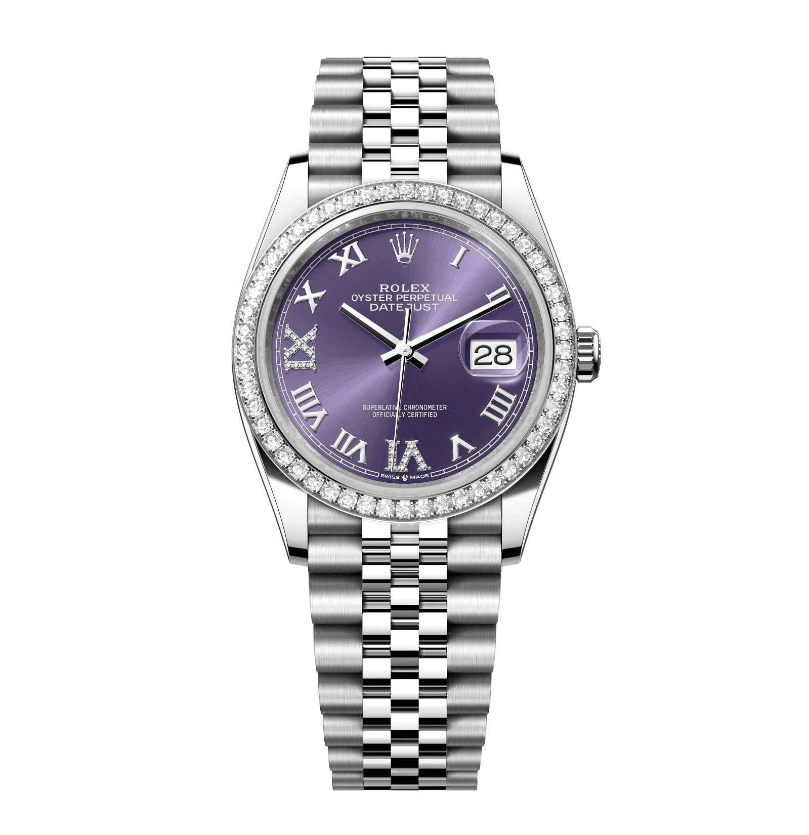 Rolex Datejust – 36 mm – פלדה רצועת ג'ובילי באזל יהלומים לוח רומי סגול גימור שוויצרי