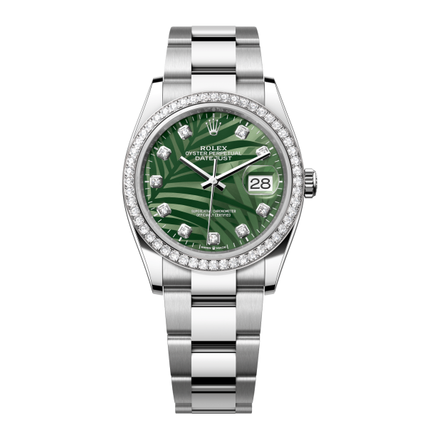 Rolex Datejust – 36 mm – פלדה רצועת אויסטר באזל יהלומים לוח עלה דקל ירוק יהלומים