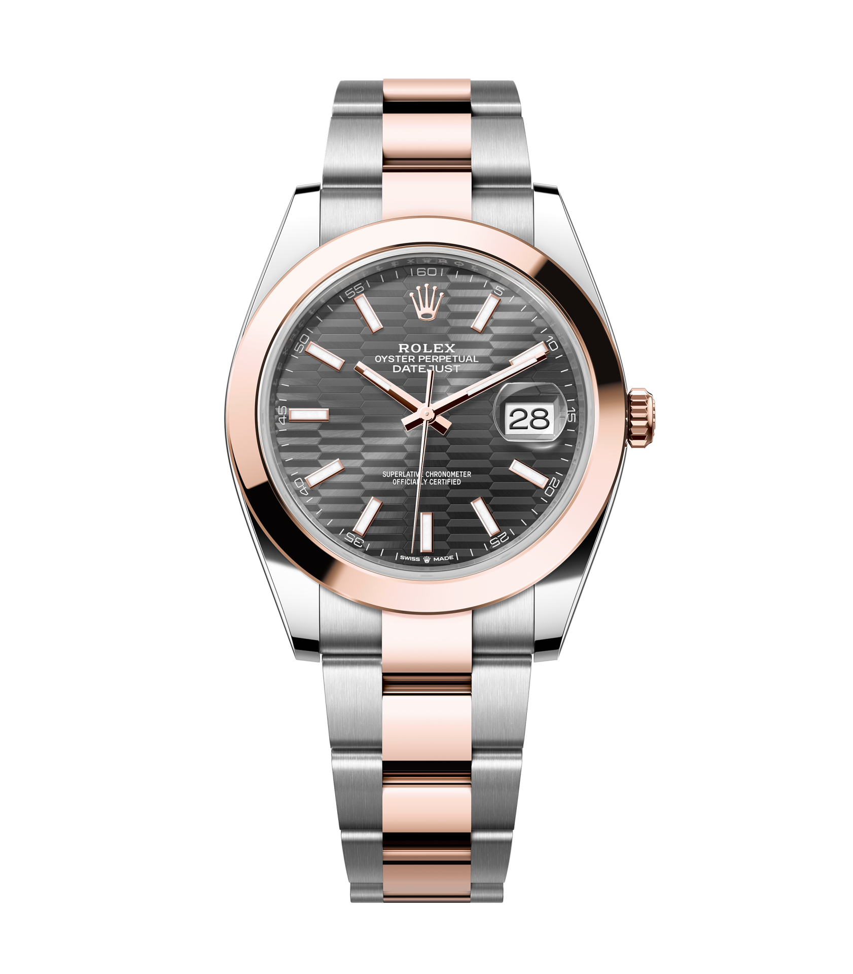 Rolex Datejust – 41 mm – טו טון רוז גולד רצועת אויסטר באזל חלק לוח מוטיף אפור גימור קצה
