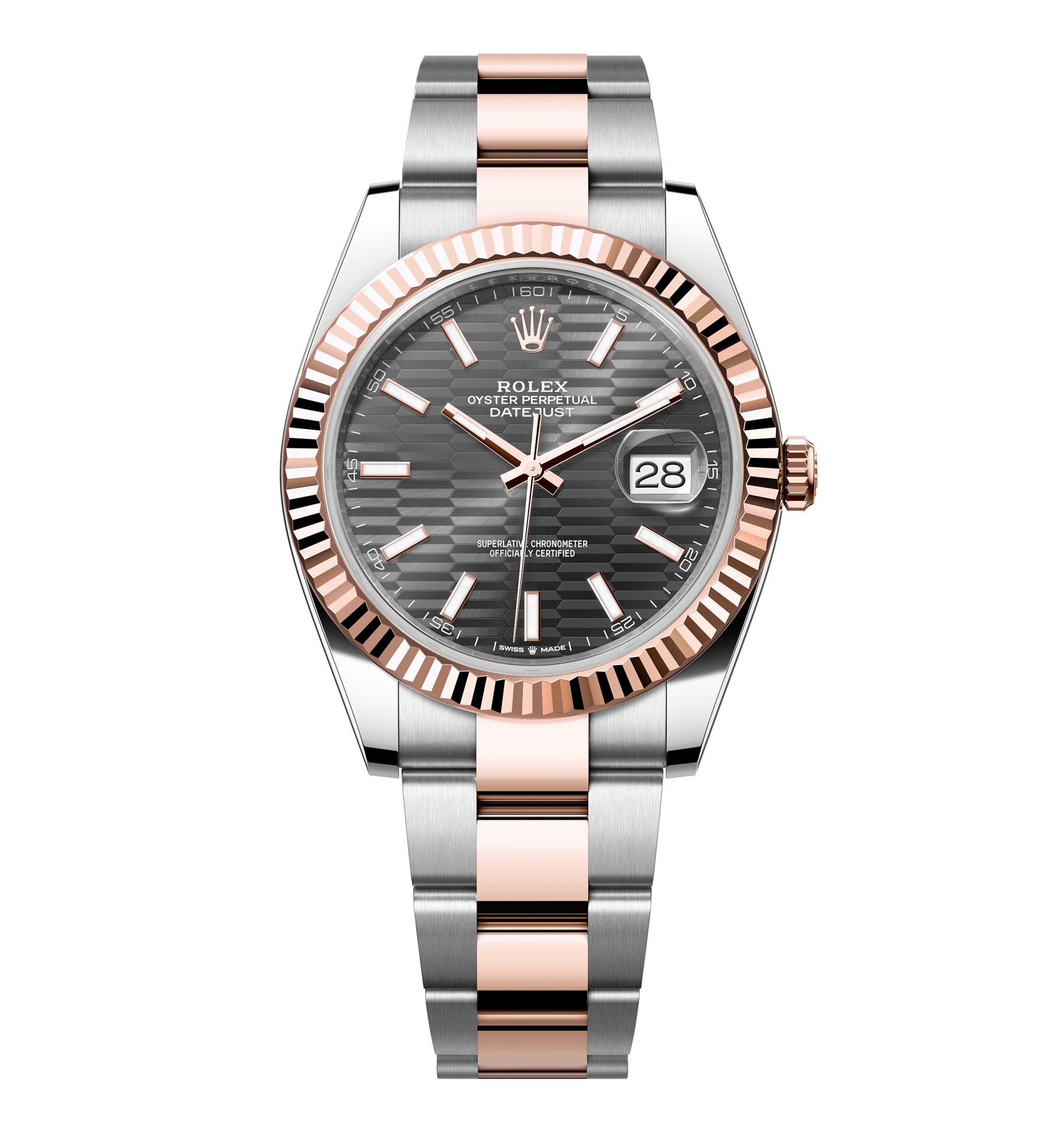 Rolex Datejust – 41 mm – טו טון רוז גולד רצועת אויסטר באזל משונן לוח מוטיף אפור גימור שוויצרי