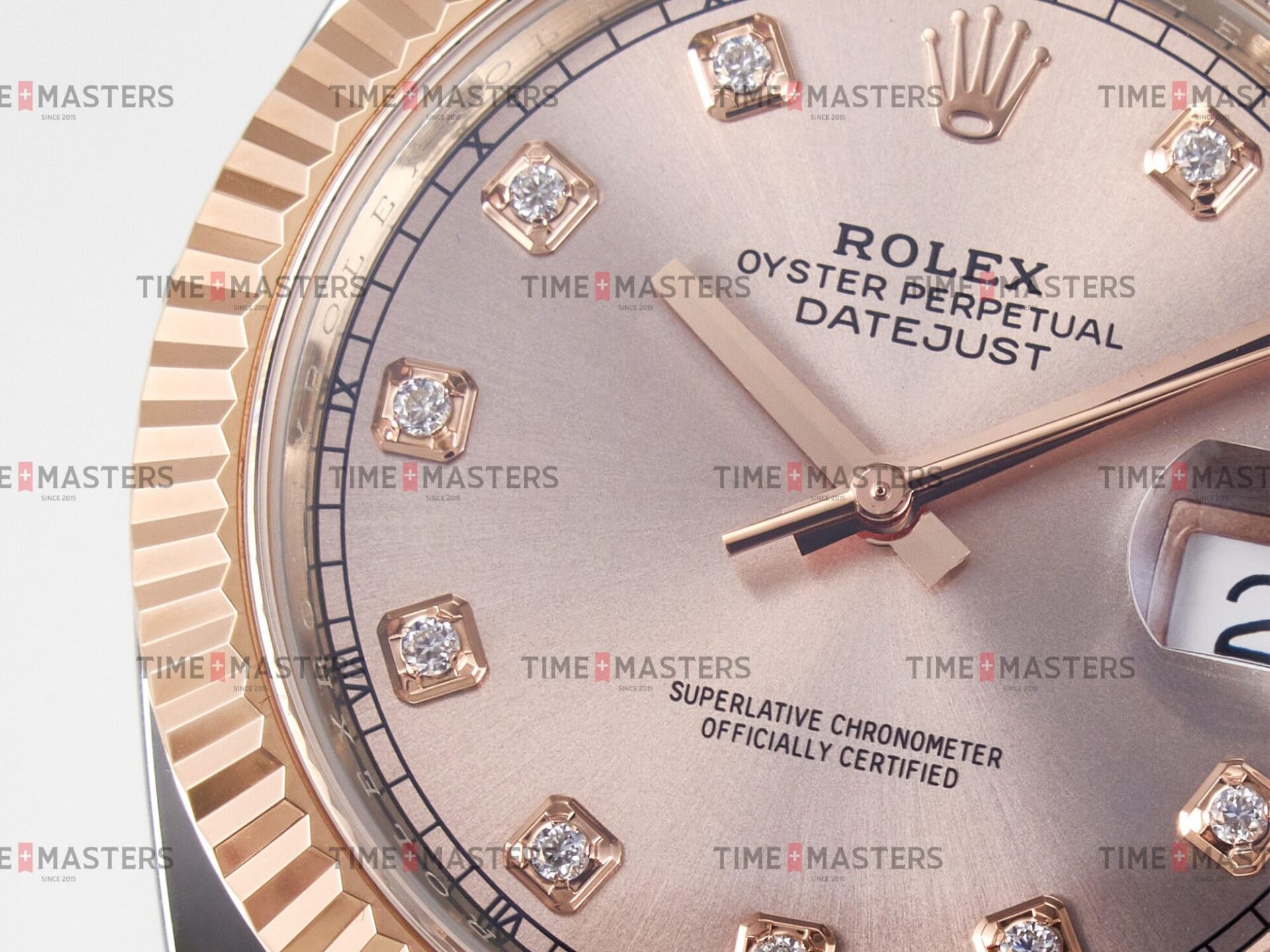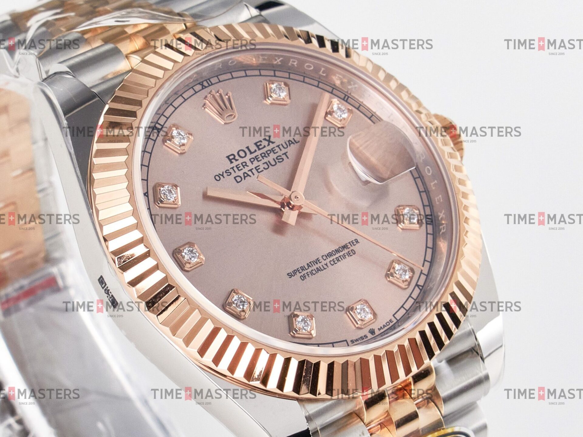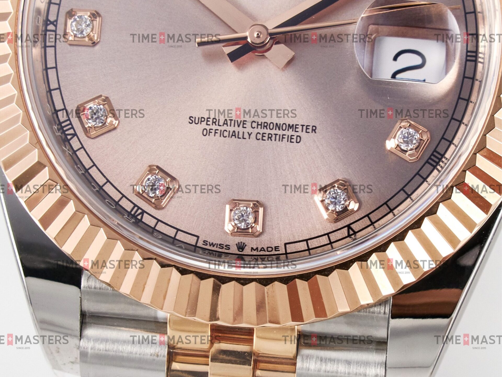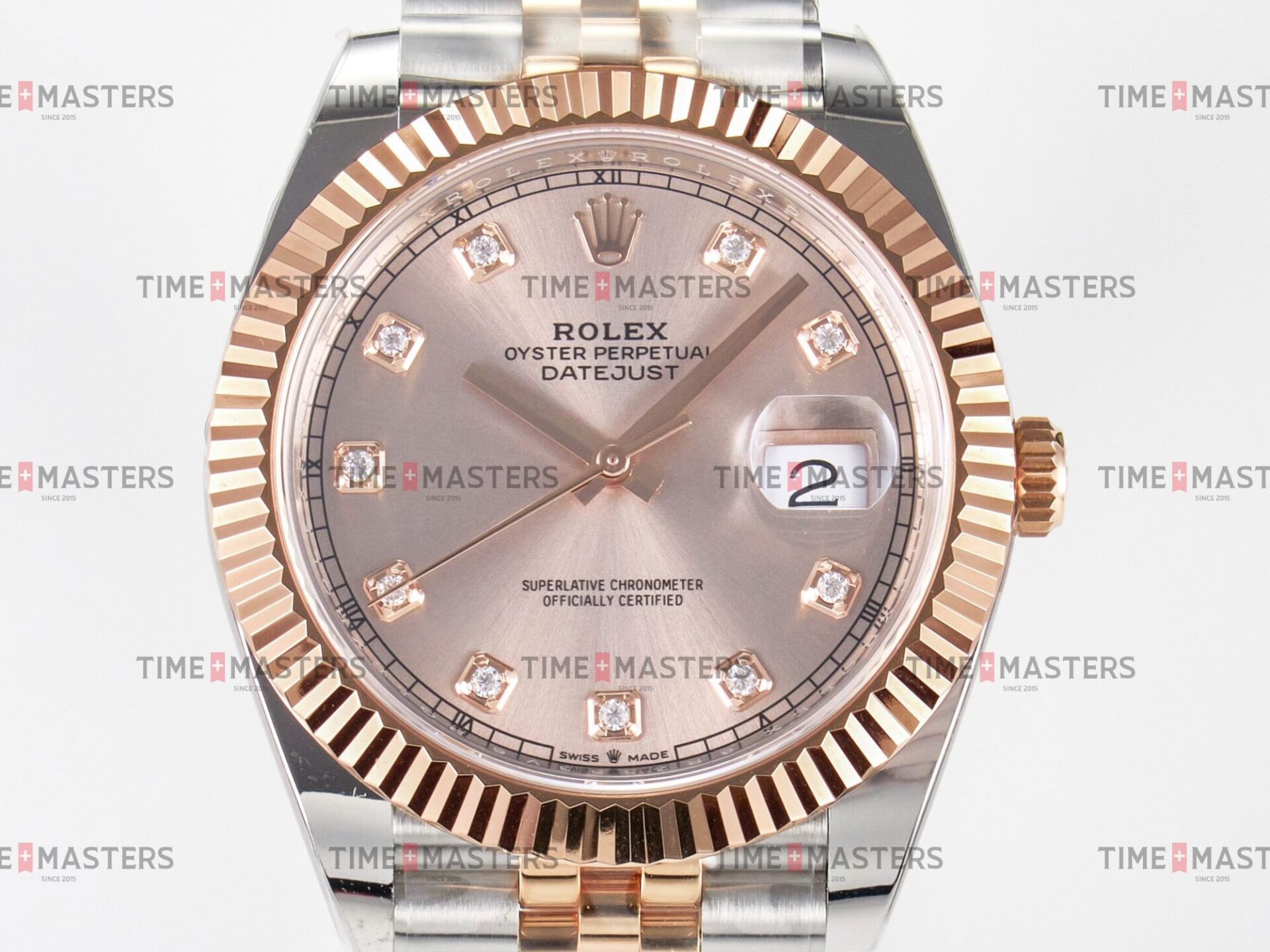Rolex Datejust – 41 mm – טו טון רוז גולד רצועת ג'ובילי באזל משונן לוח סאנדסט יהלומים גימור קצה