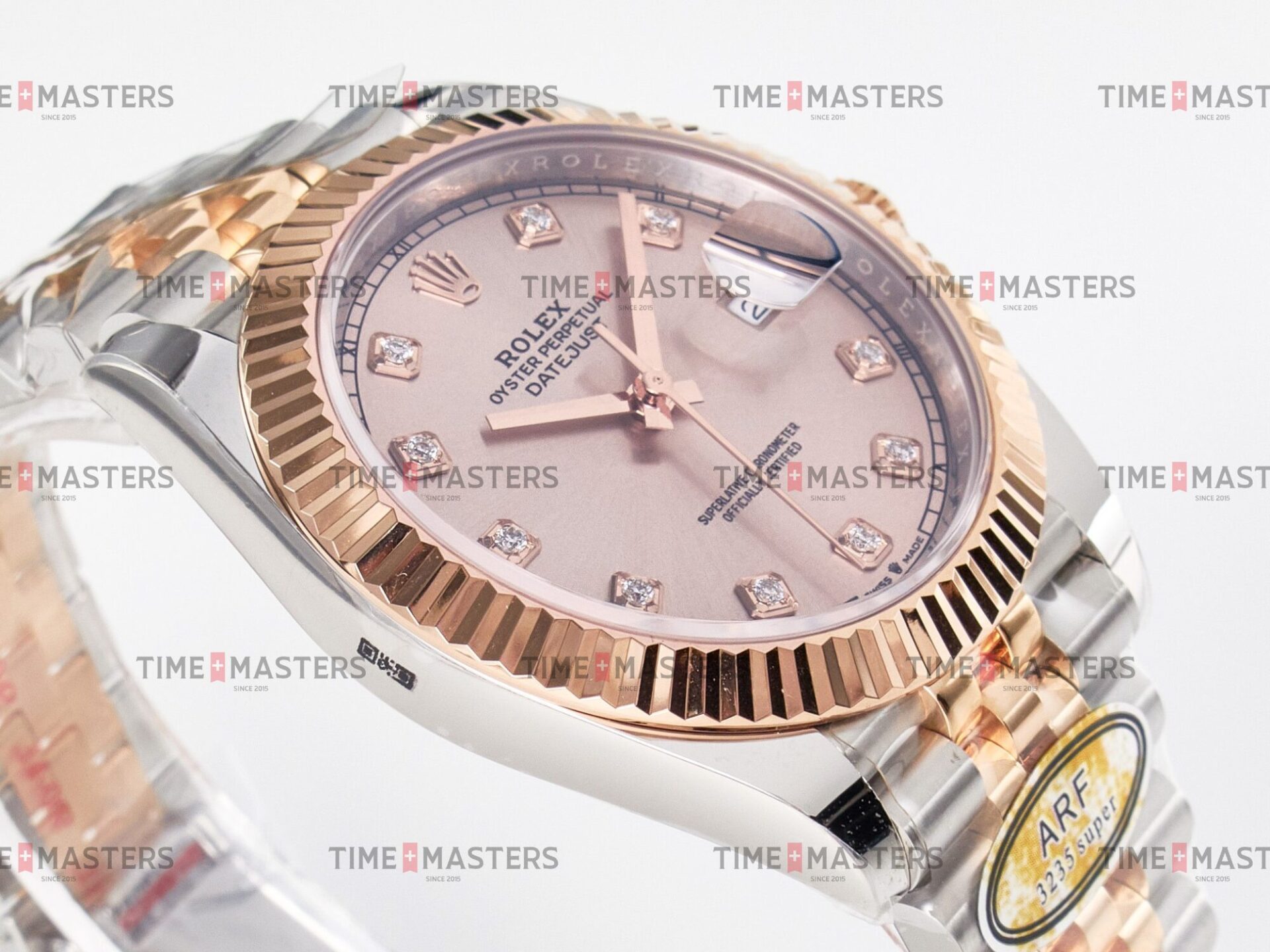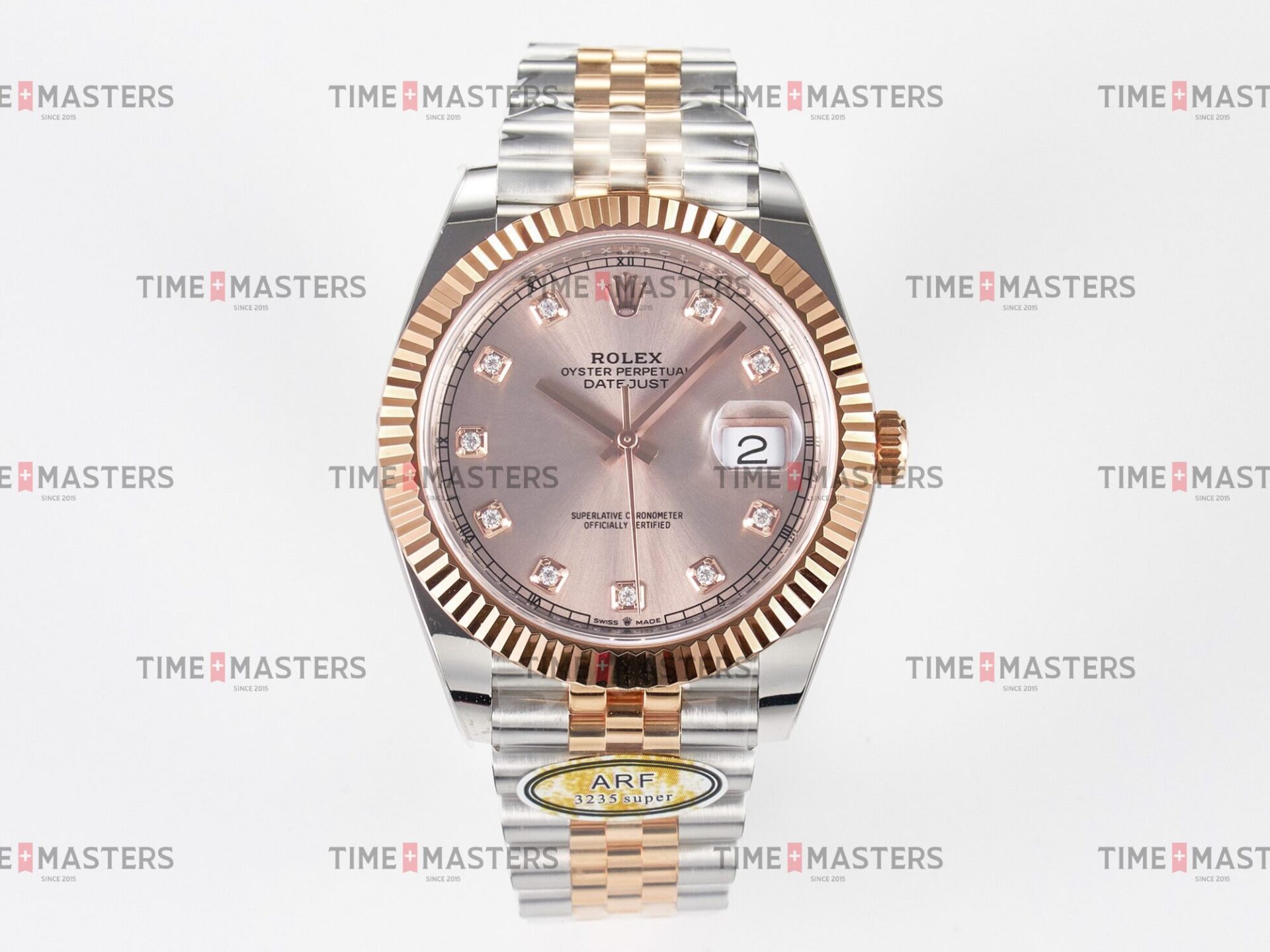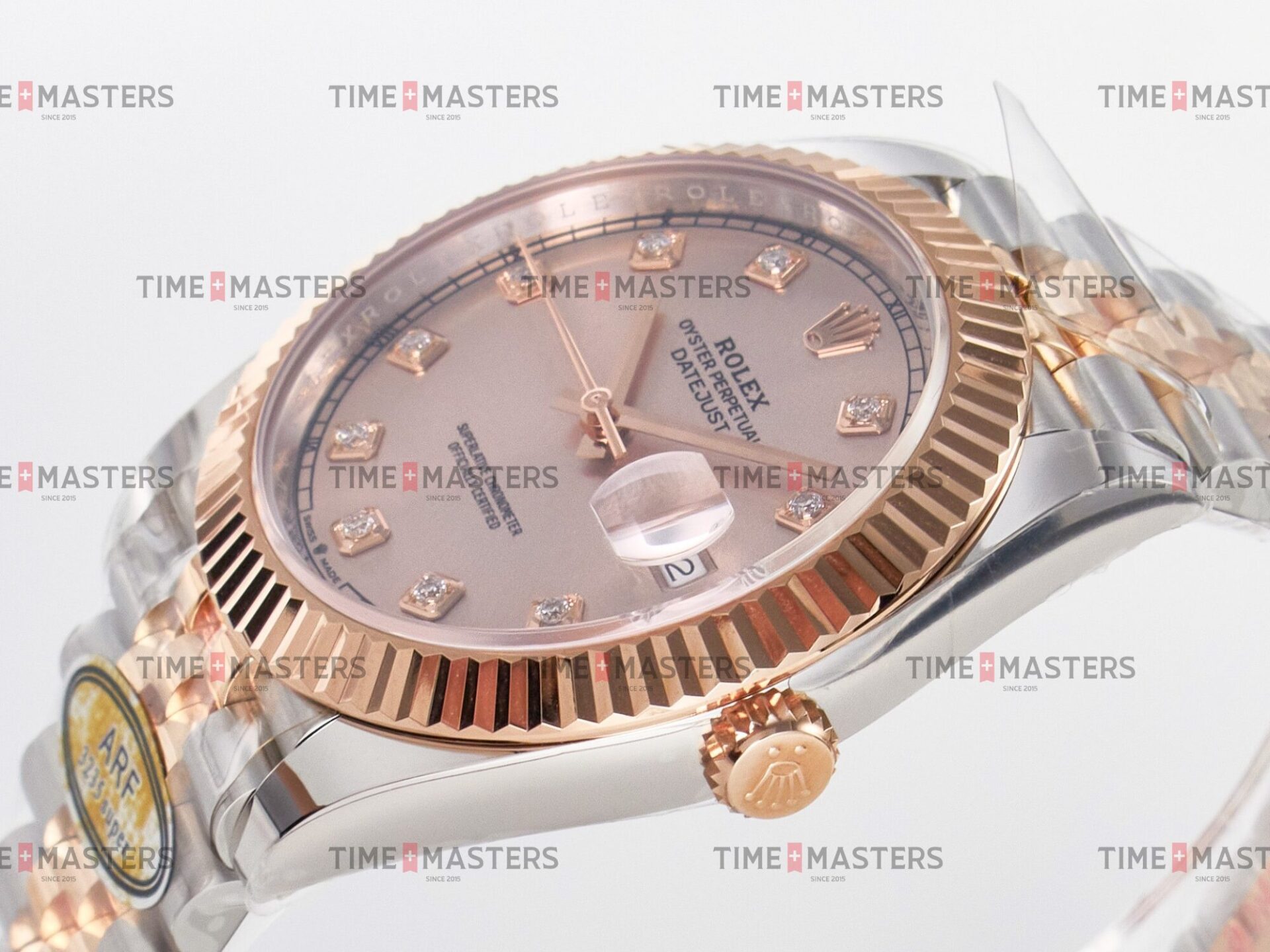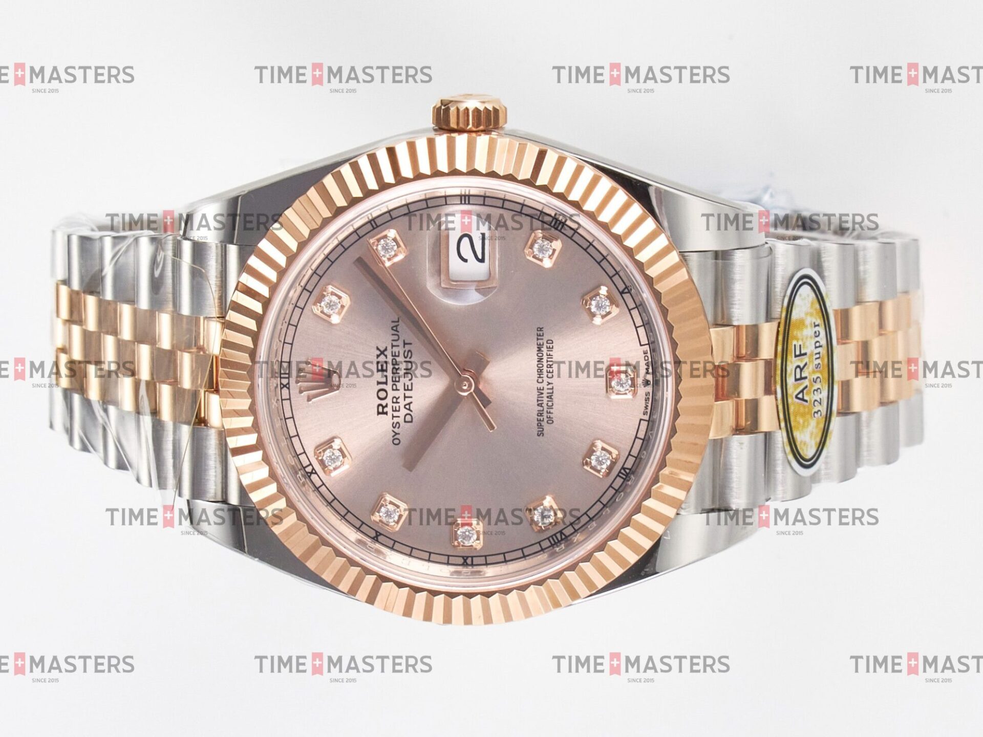 Rolex Datejust – 41 mm – טו טון רוז גולד רצועת ג'ובילי באזל משונן לוח סאנדסט יהלומים גימור קצה