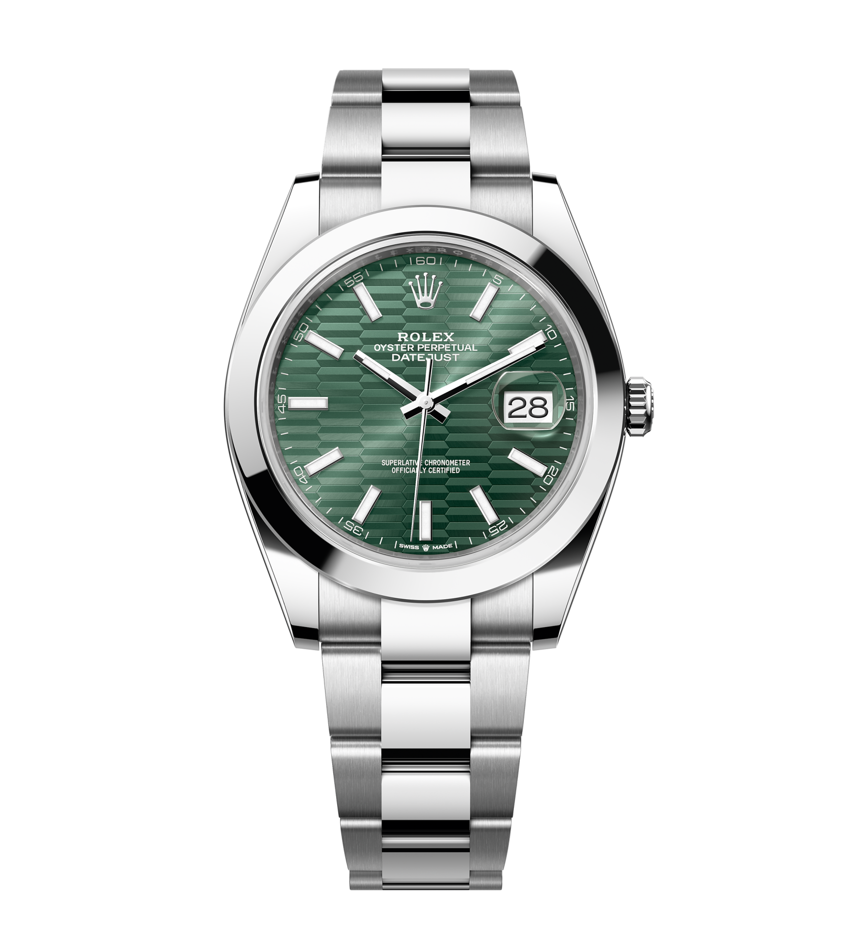Rolex Datejust – 41 mm – פלדה רצועת אויסטר באזל חלק לוח מוטיף ירוק גימור קצה