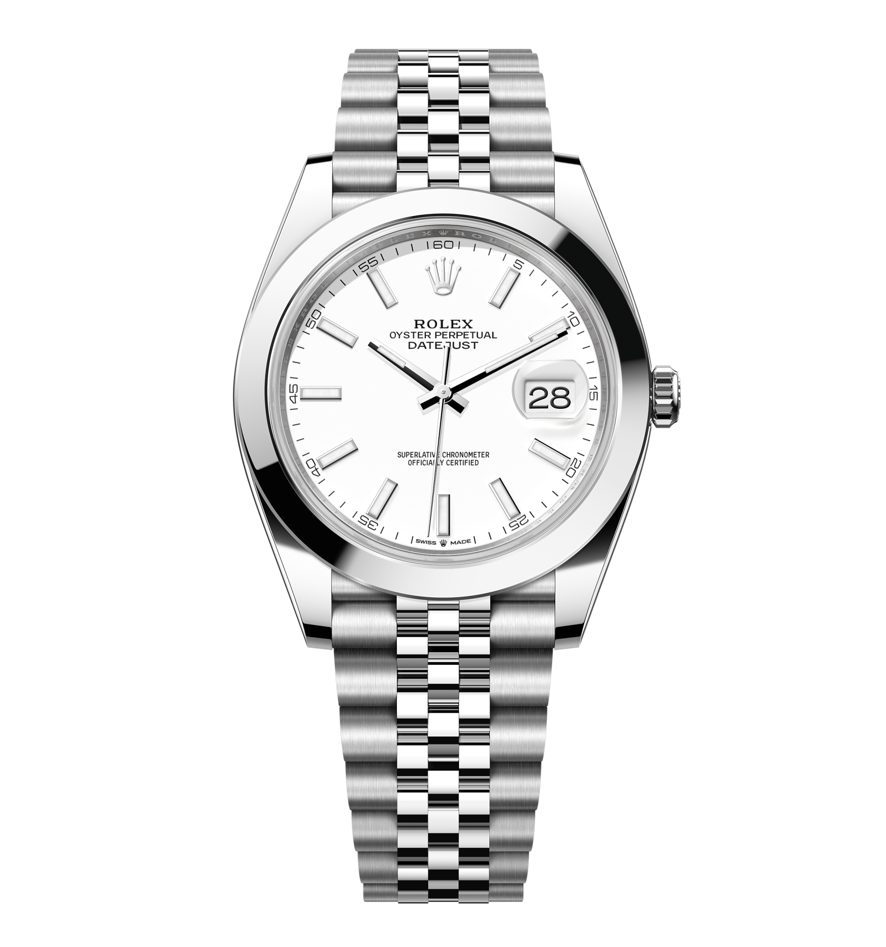 Rolex Datejust – 41 mm – פלדה רצועת ג'ובילי באזל חלק לוח לבן גימור קצה