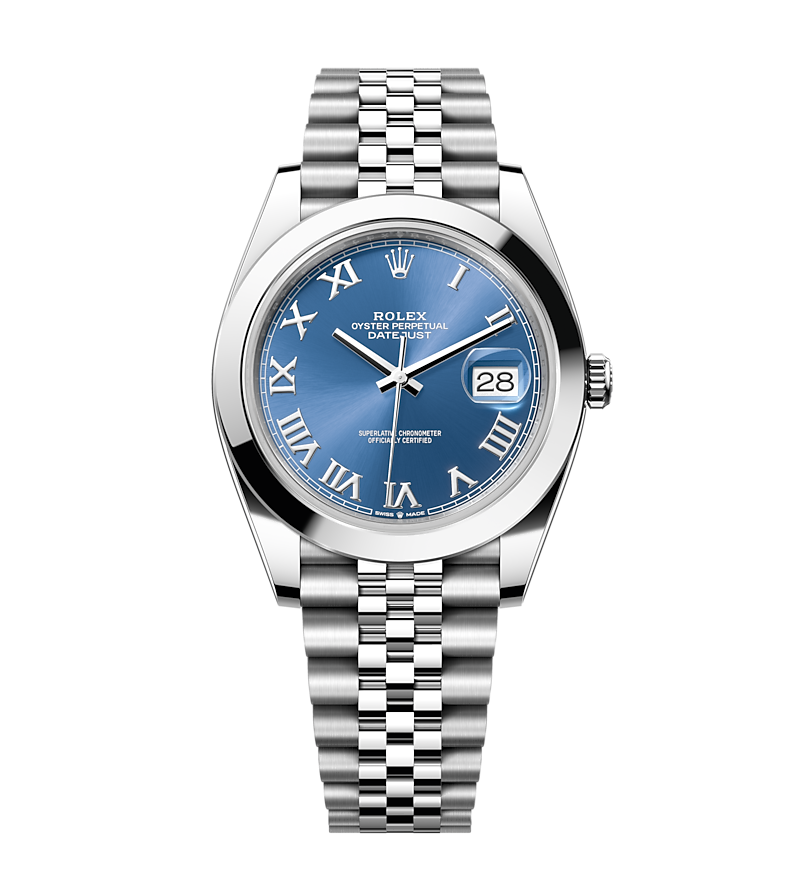 Rolex Datejust – 41 mm – פלדה רצועת ג'ובילי באזל חלק לוח רומי כחול גימור שוויצרי
