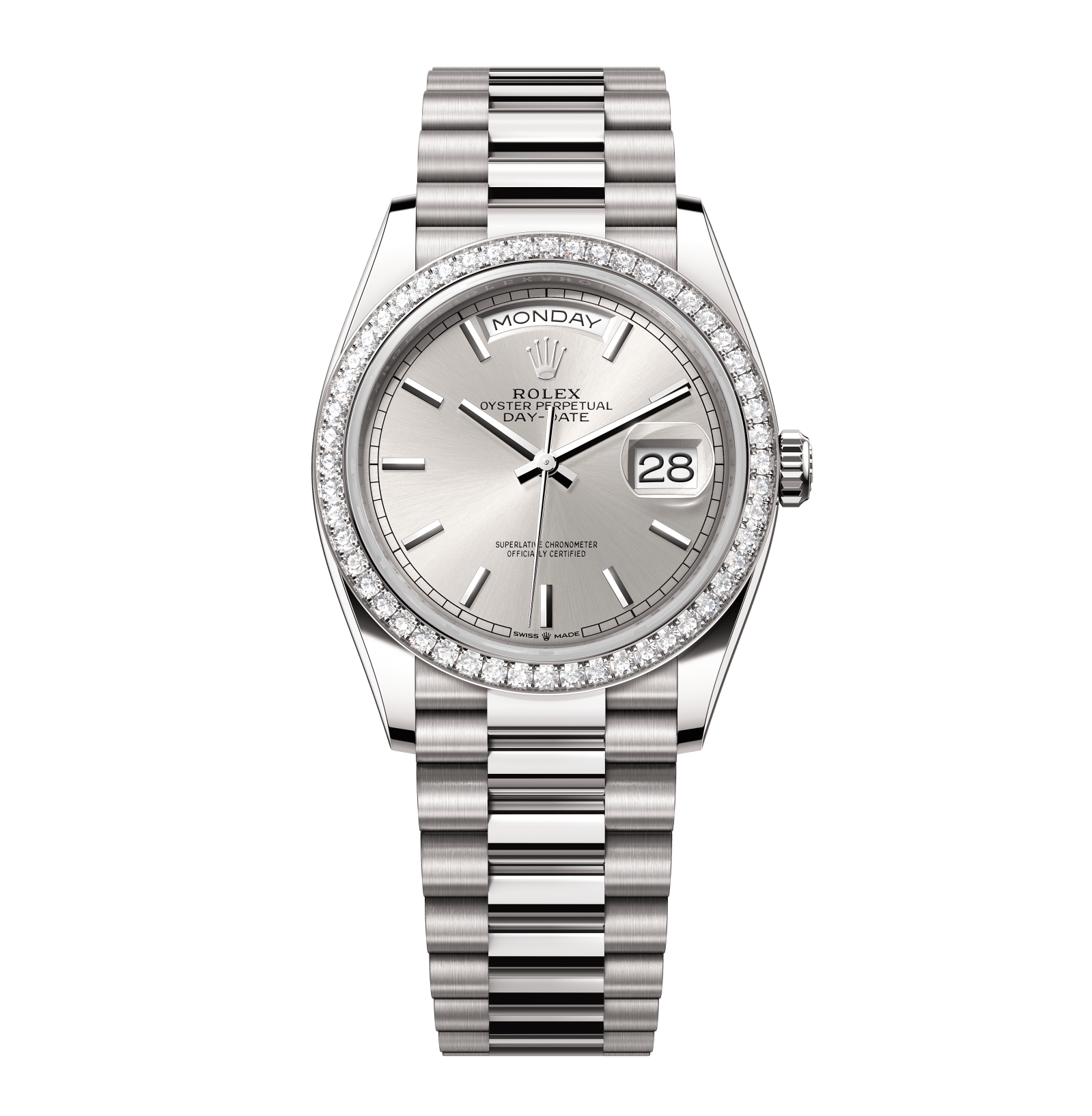 Rolex Day-Date – 36 mm – זהב לבן רצועת ג'ובילי באזל יהלומים לוח סילבר גימור קצה