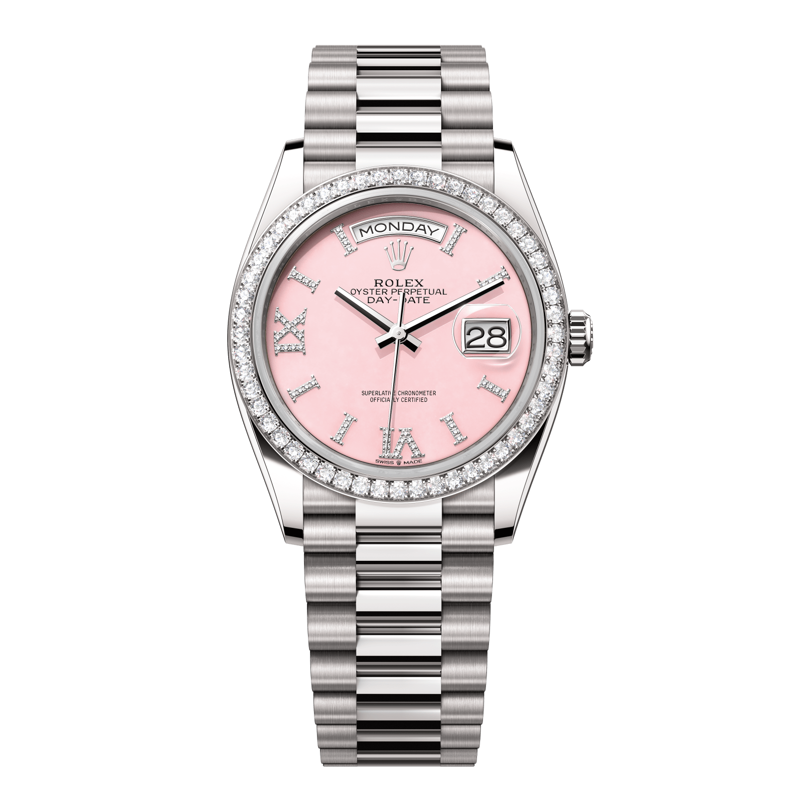 Rolex Day-Date – 36 mm – זהב לבן רצועת ג'ובילי באזל יהלומים לוח רומי ורוד גימור שוויצרי