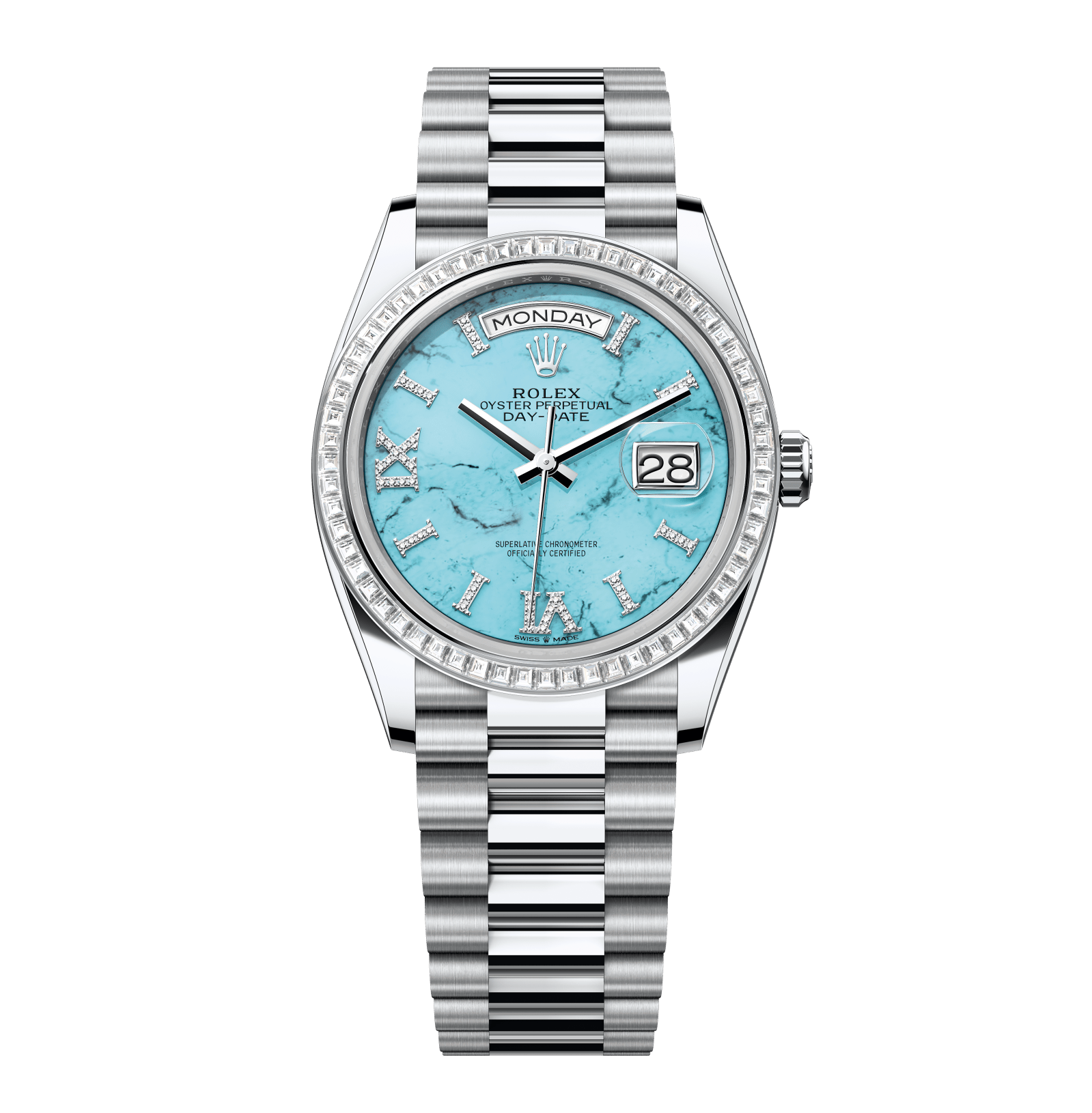 Rolex Day-Date – 36 mm – זהב לבן רצועת ג'ובילי באזל יהלומים לוח תכלת גימור שוויצרי