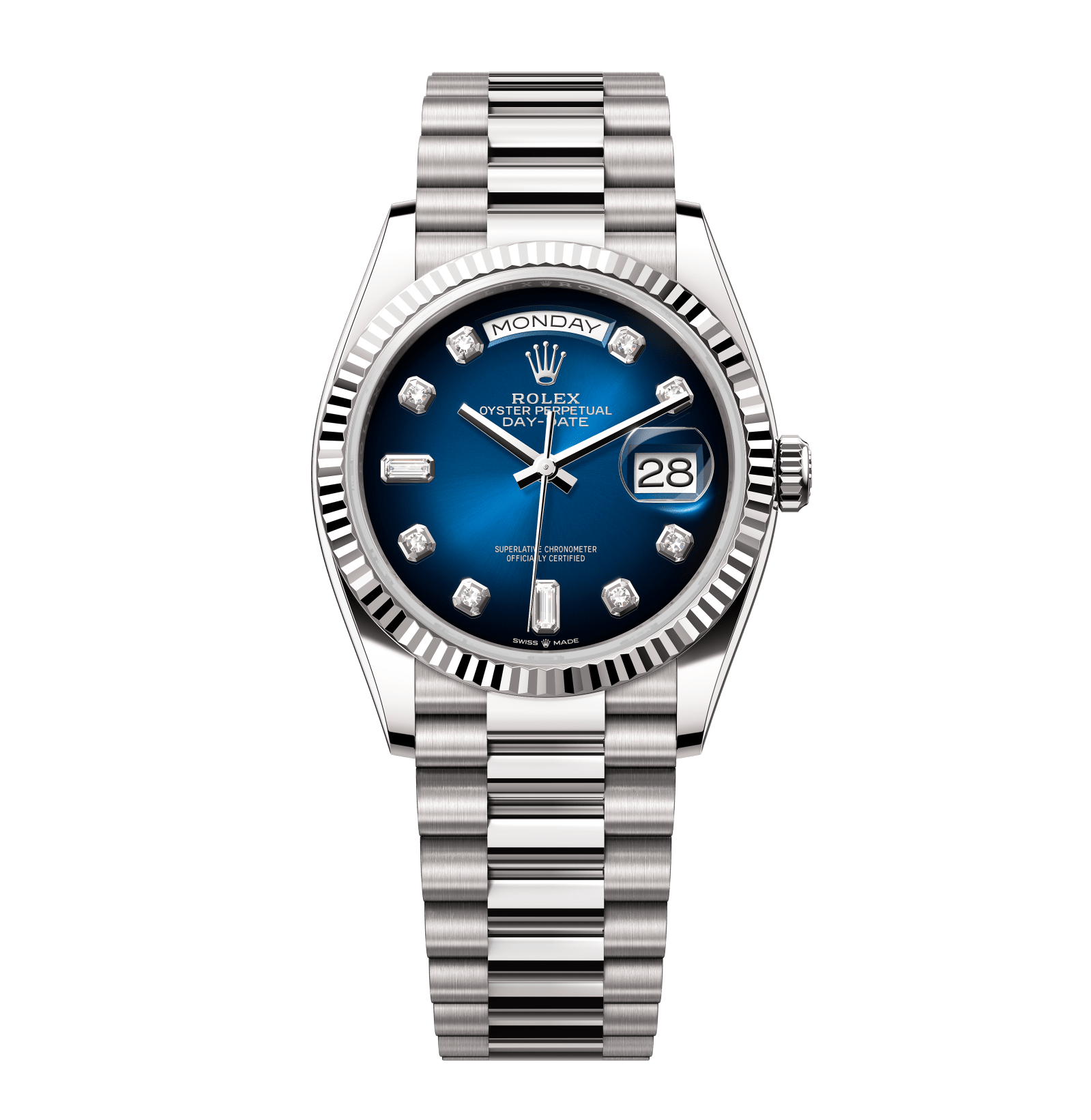 Rolex Day-Date – 36 mm – זהב לבן רצועת ג'ובילי באזל משונן לוח כחול יהלומים גימור קצה