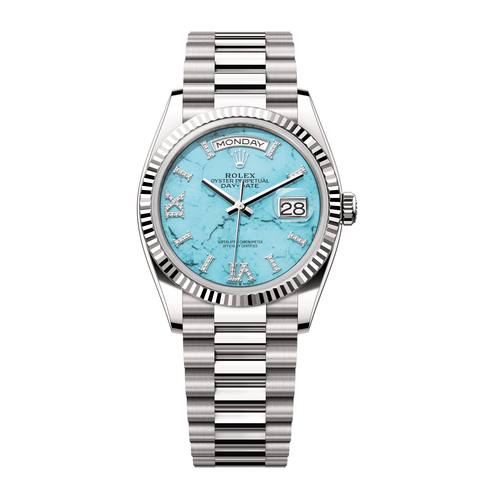 Rolex Day-Date – 36 mm – זהב לבן רצועת ג'ובילי באזל משונן לוח רומי תכלת גימור שוויצרי