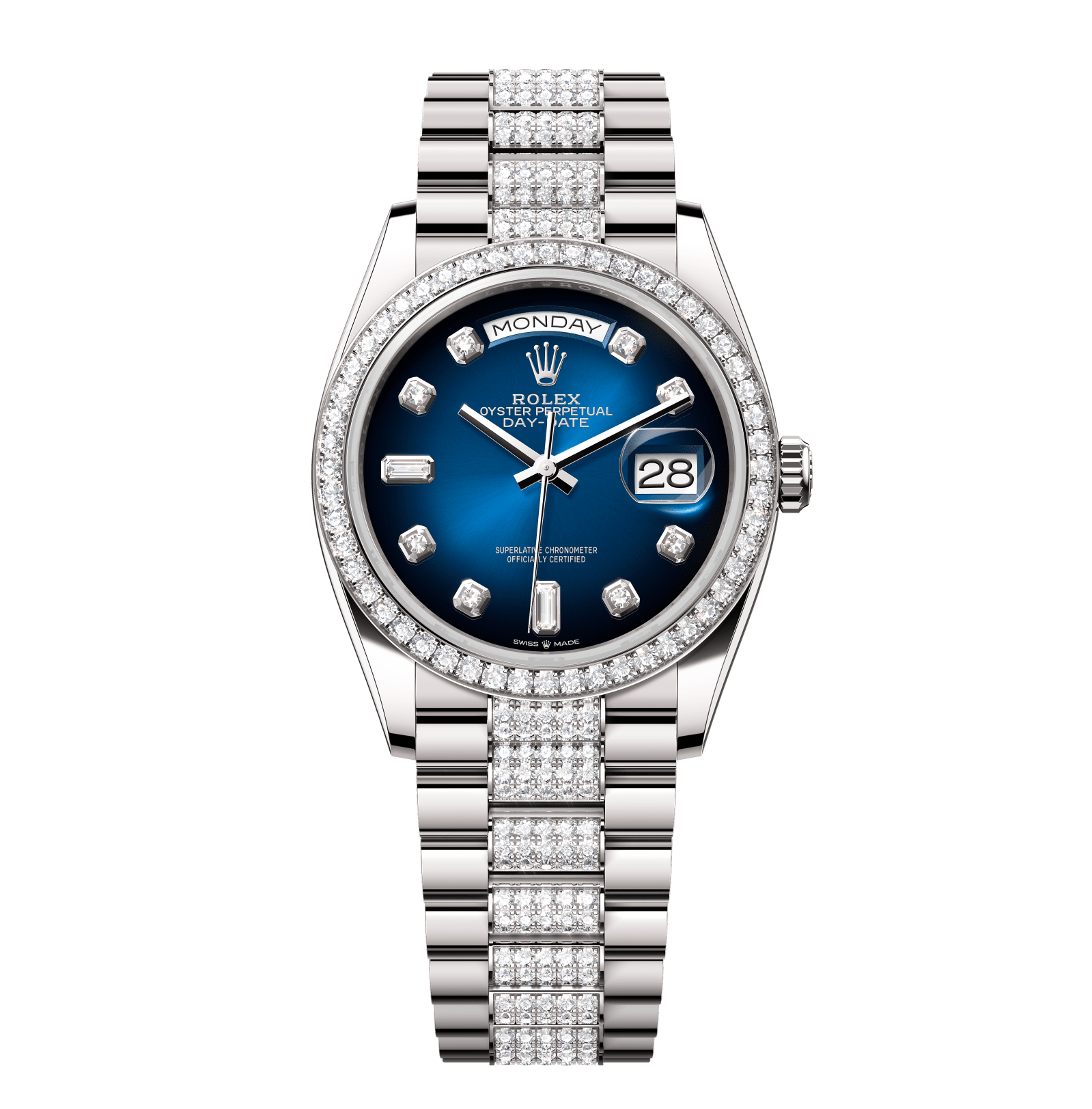 Rolex Day-Date – 36 mm – זהב לבן רצועת יהלומים באזל יהלומים לוח כחול יהלומים גימור שוויצרי