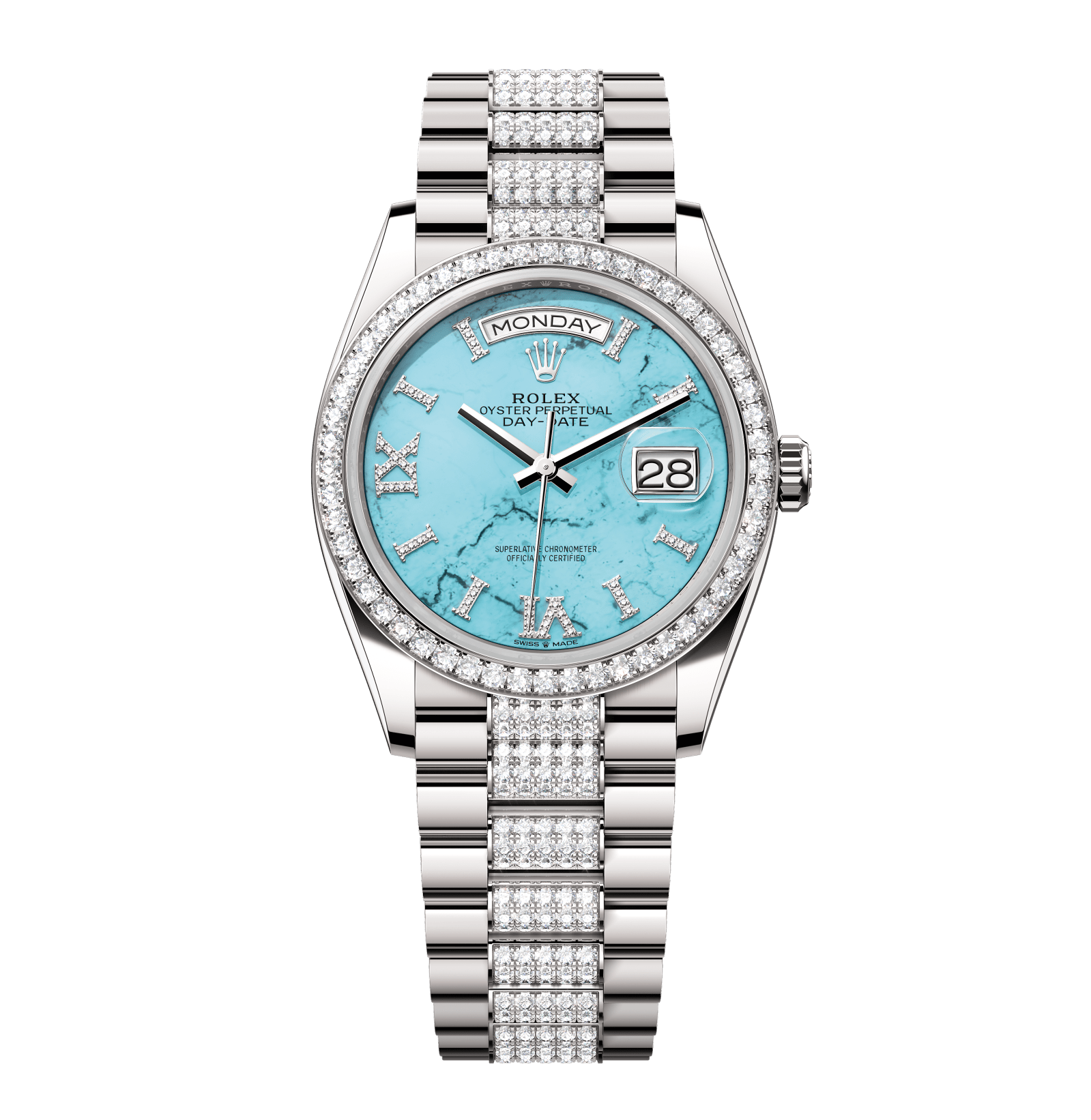 Rolex Day-Date – 36 mm – זהב לבן רצועת יהלומים באזל יהלומים לוח תכלת גימור קצה
