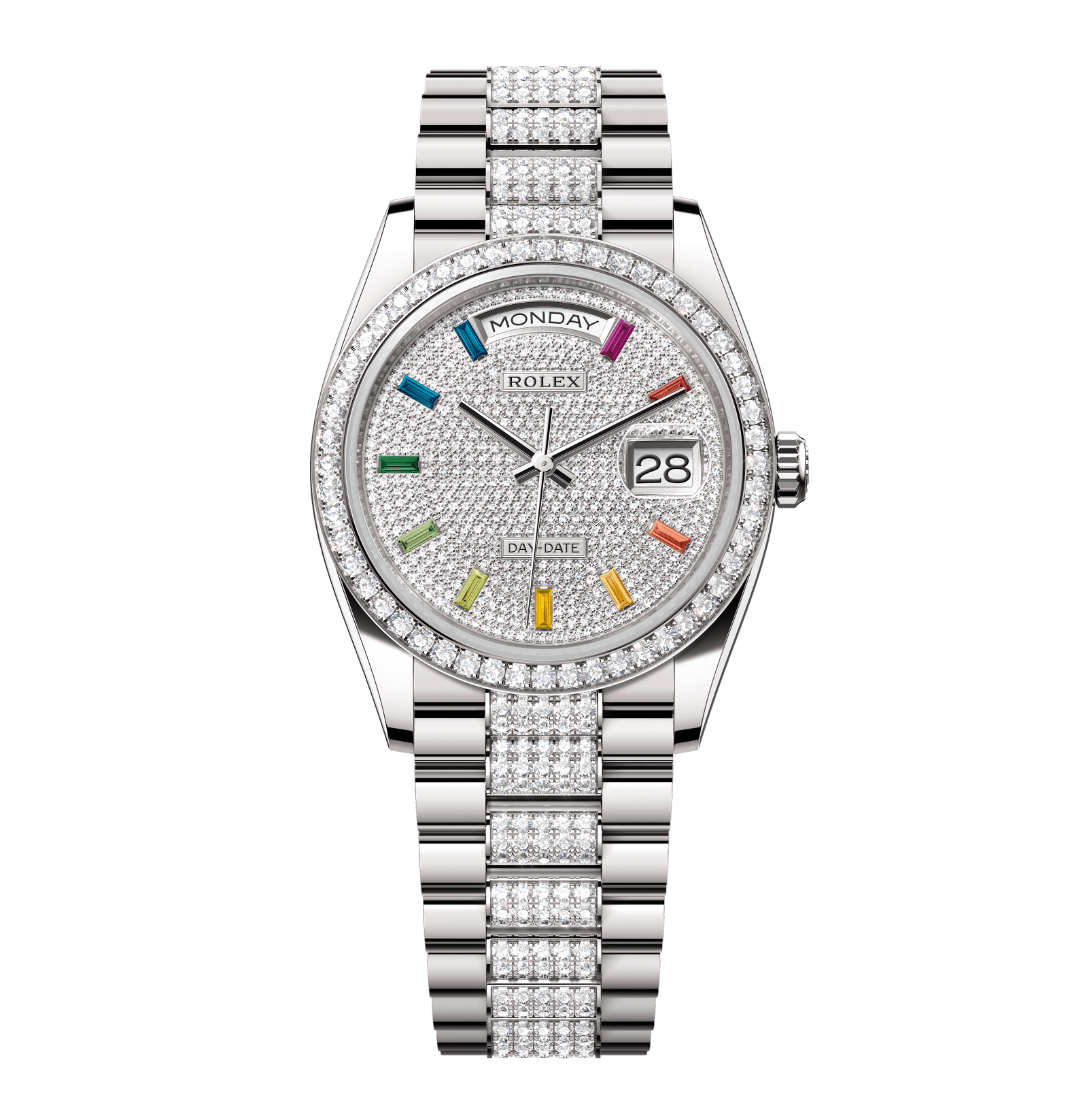 Rolex Day-Date – 36 mm – זהב לבן רצועת יהלומים באזל יהלומים לוח יהלומים קשת בענן גימור קצה