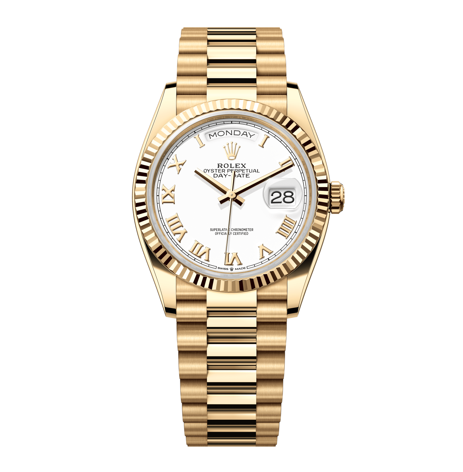 Rolex Day-Date – 36 mm – זהב צהוב רצועת ג'ובילי באזל משונן לוח רומי לבן גימור קצה