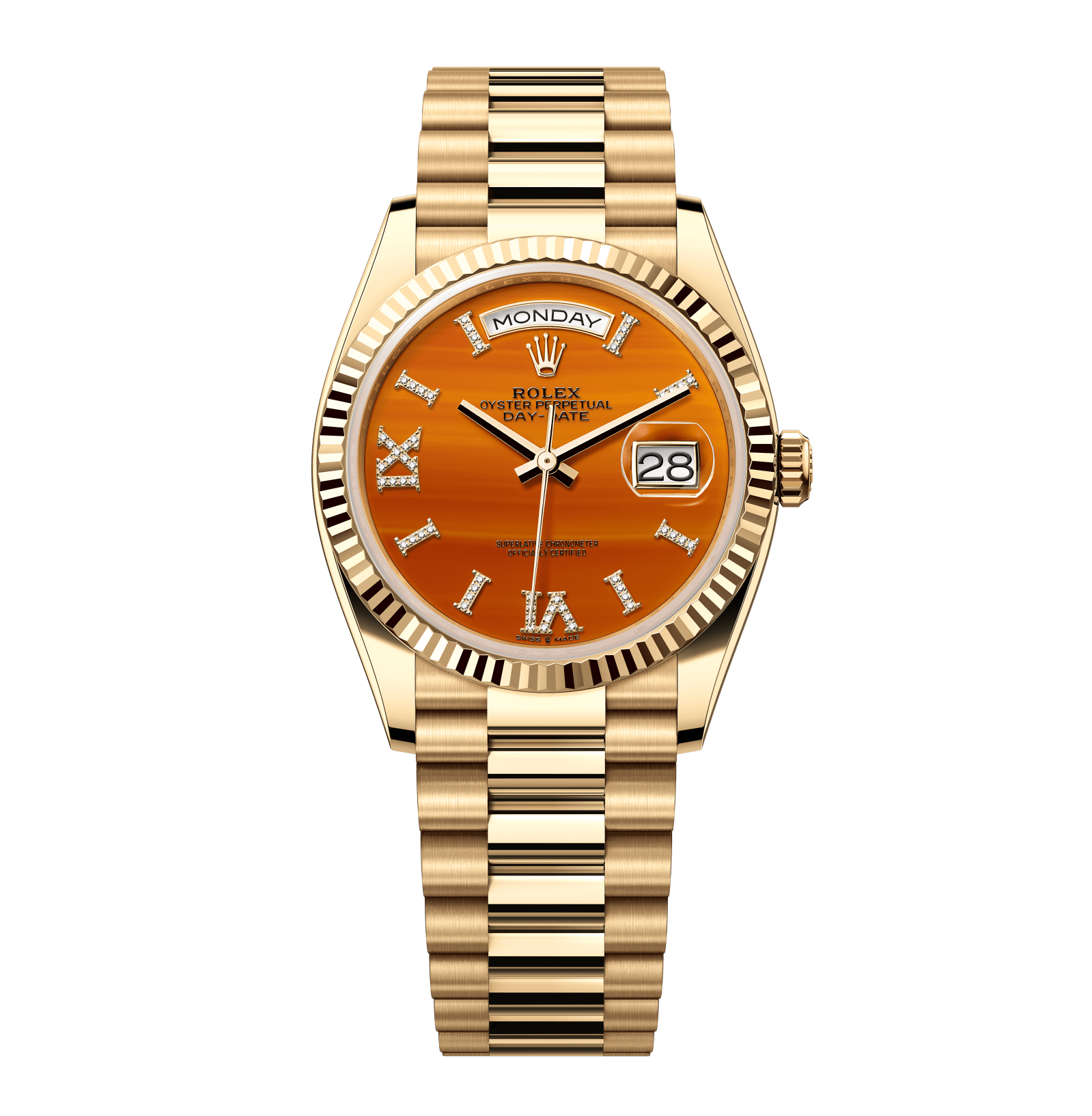 Rolex Day-Date – 36 mm – זהב צהוב רצועת ג'ובילי באזל משונן לוח רומי קרנליאן גימור שוויצרי