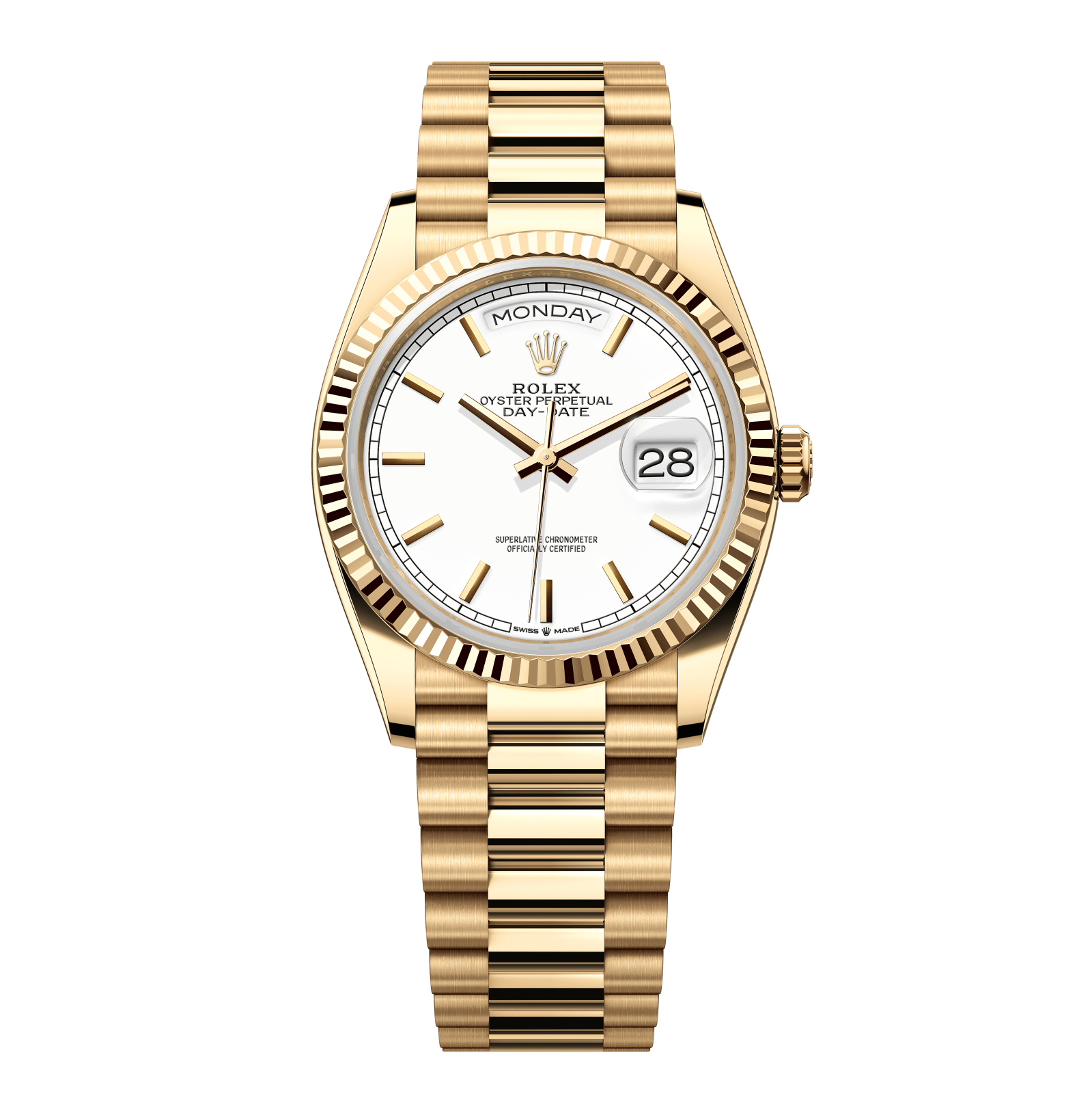 Rolex Day-Date – 36 mm – זהב צהוב רצועת ג'ובילי באזל משונן לוח לבן גימור שוויצרי