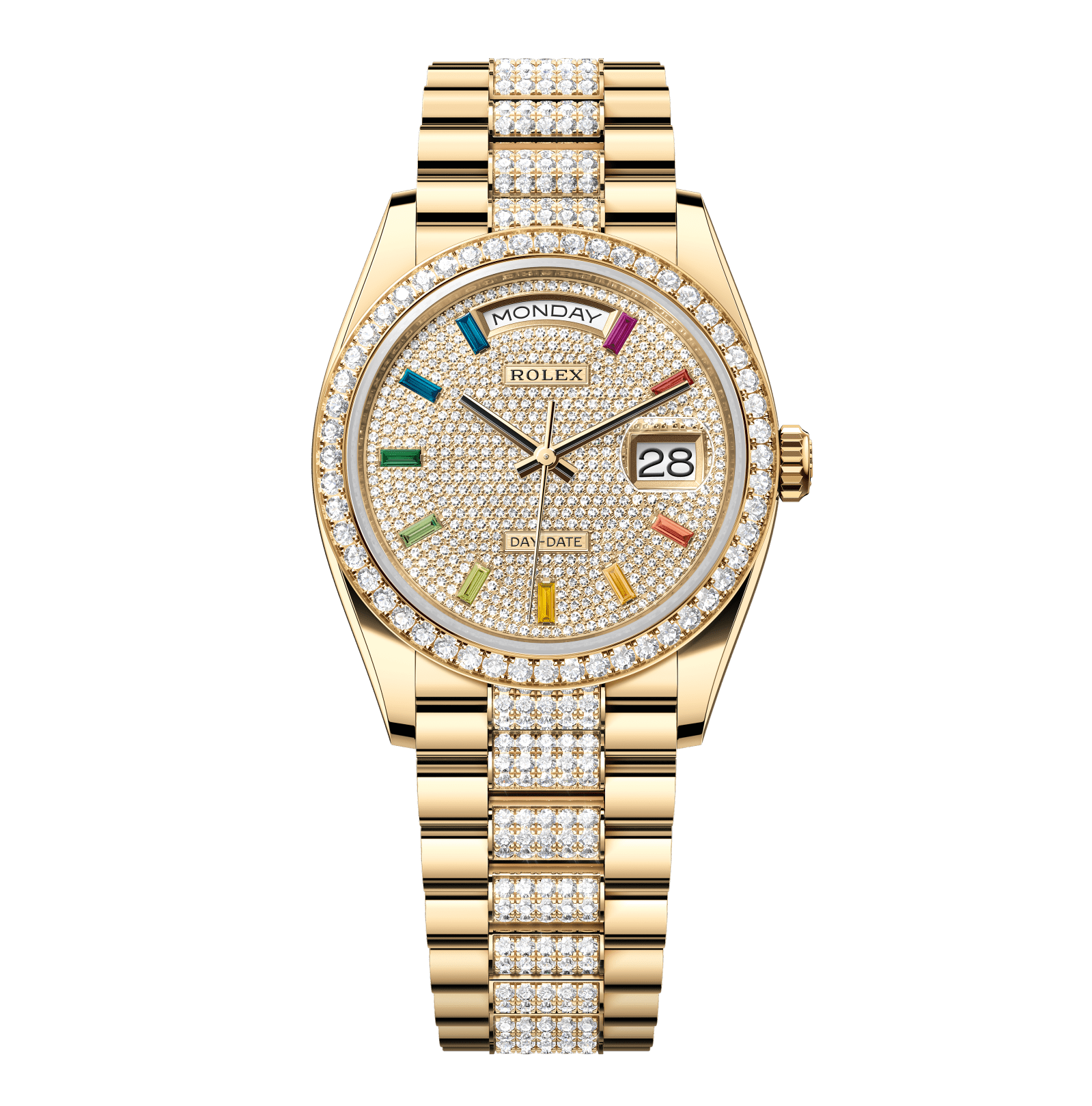 Rolex Day-Date – 36 mm – זהב צהוב רצועת יהלומים באזל יהלומים לוח יהלומים קשת בענן גימור קצה