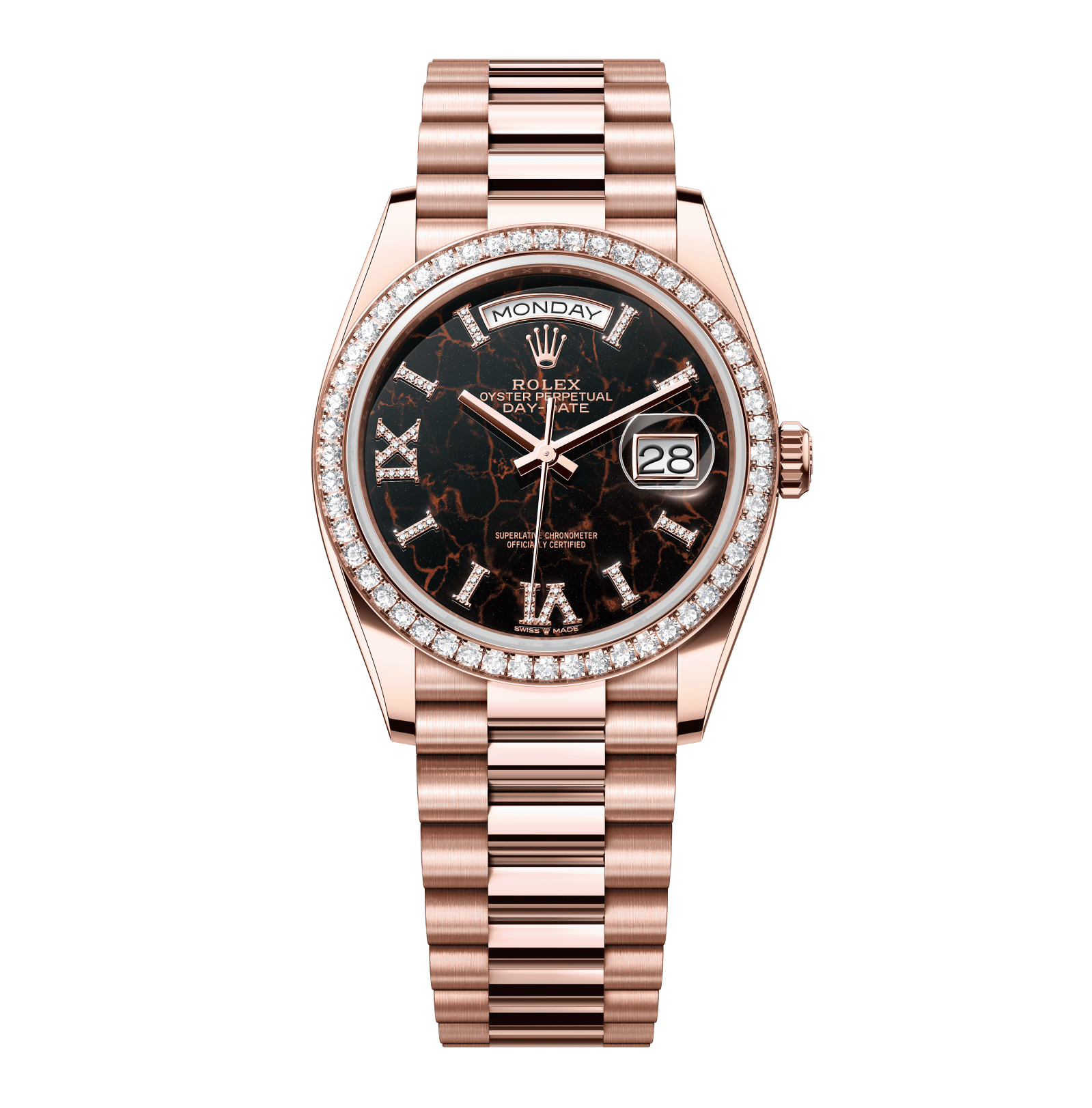 Rolex Day-Date – 36 mm – רוז גולד רצועת ג'ובילי באזל יהלומים לוח רומי אייזנקיזל גימור שוויצרי