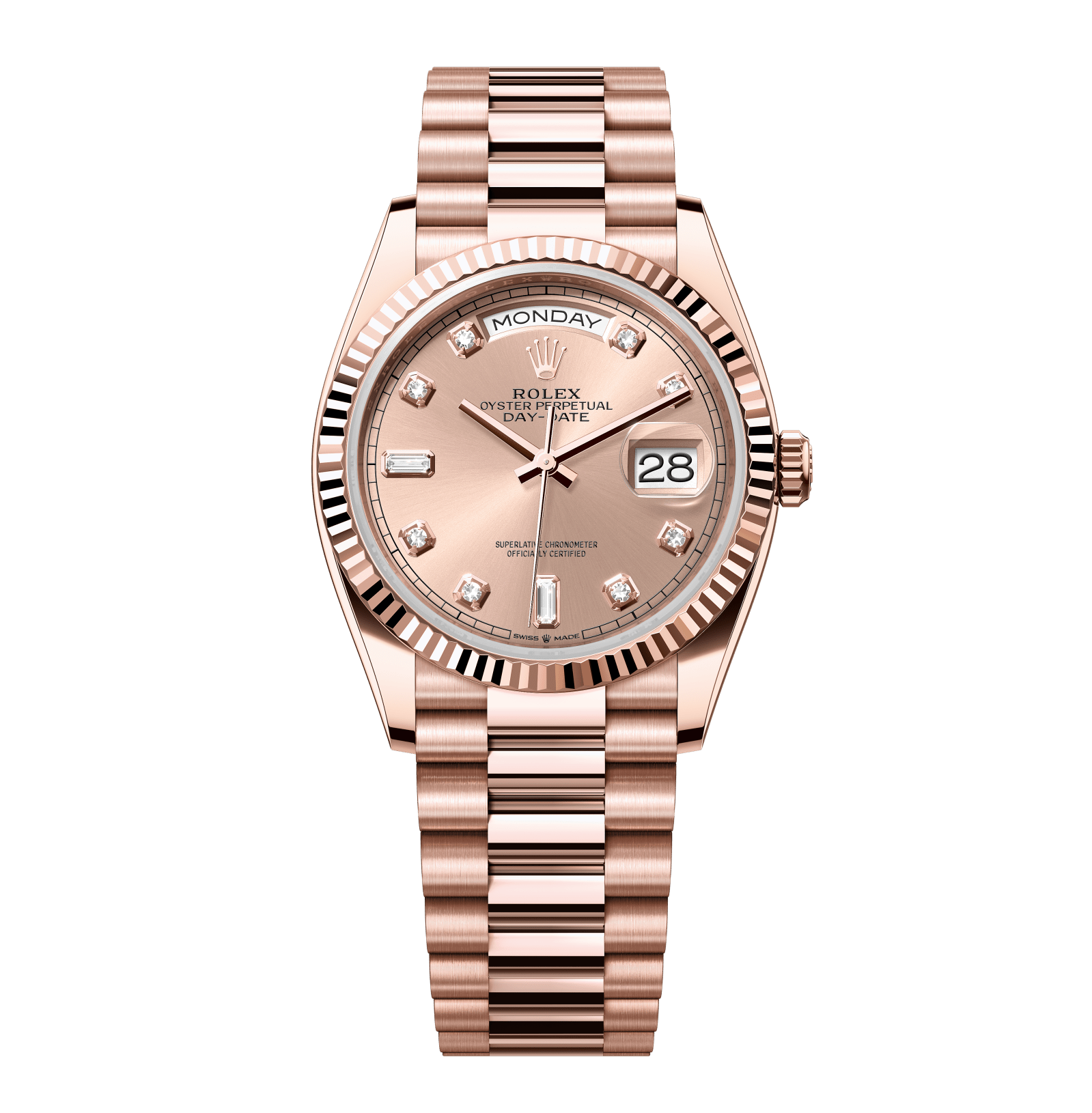 Rolex Day-Date – 36 mm – רוז גולד רצועת ג'ובילי באזל משונן לוח סאנדסט יהלומים גימור שוויצרי