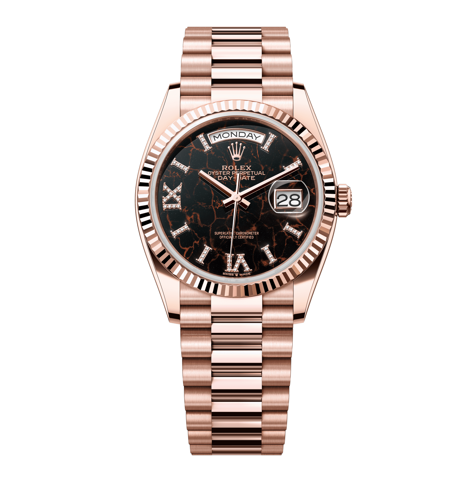 Rolex Day-Date – 36 mm – רוז גולד רצועת ג'ובילי באזל משונן לוח רומי אייזנקיזל גימור שוויצרי