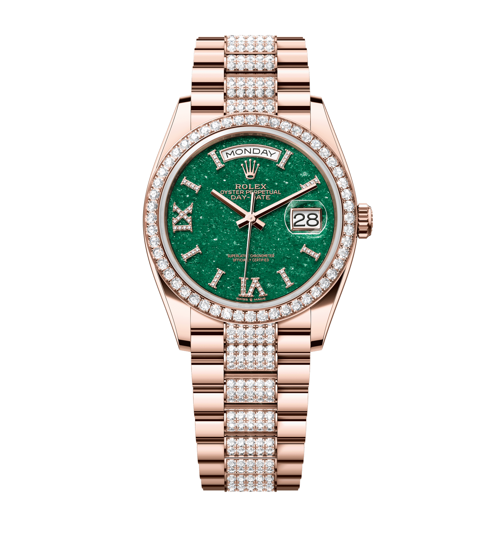 Rolex Day-Date – 36 mm – רוז גולד רצועת יהלומים באזל יהלומים לוח רומי ירוק אוונטורין גימור שוויצרי