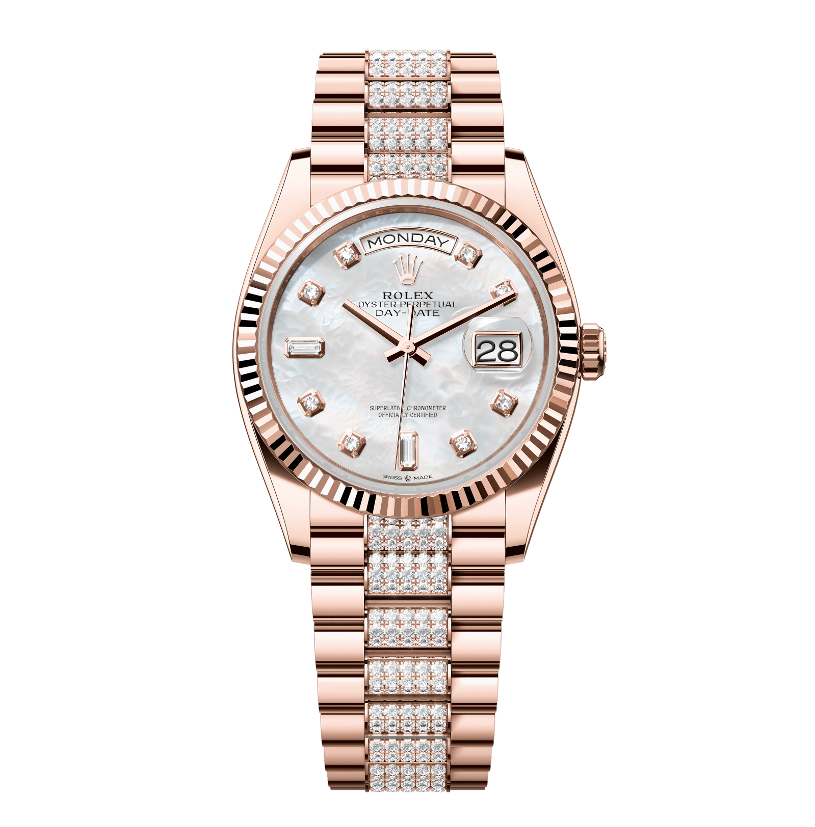 Rolex Day-Date – 36 mm – רוז גולד רצועת יהלומים באזל משונן לוח לבן יהלומים גימור שוויצרי