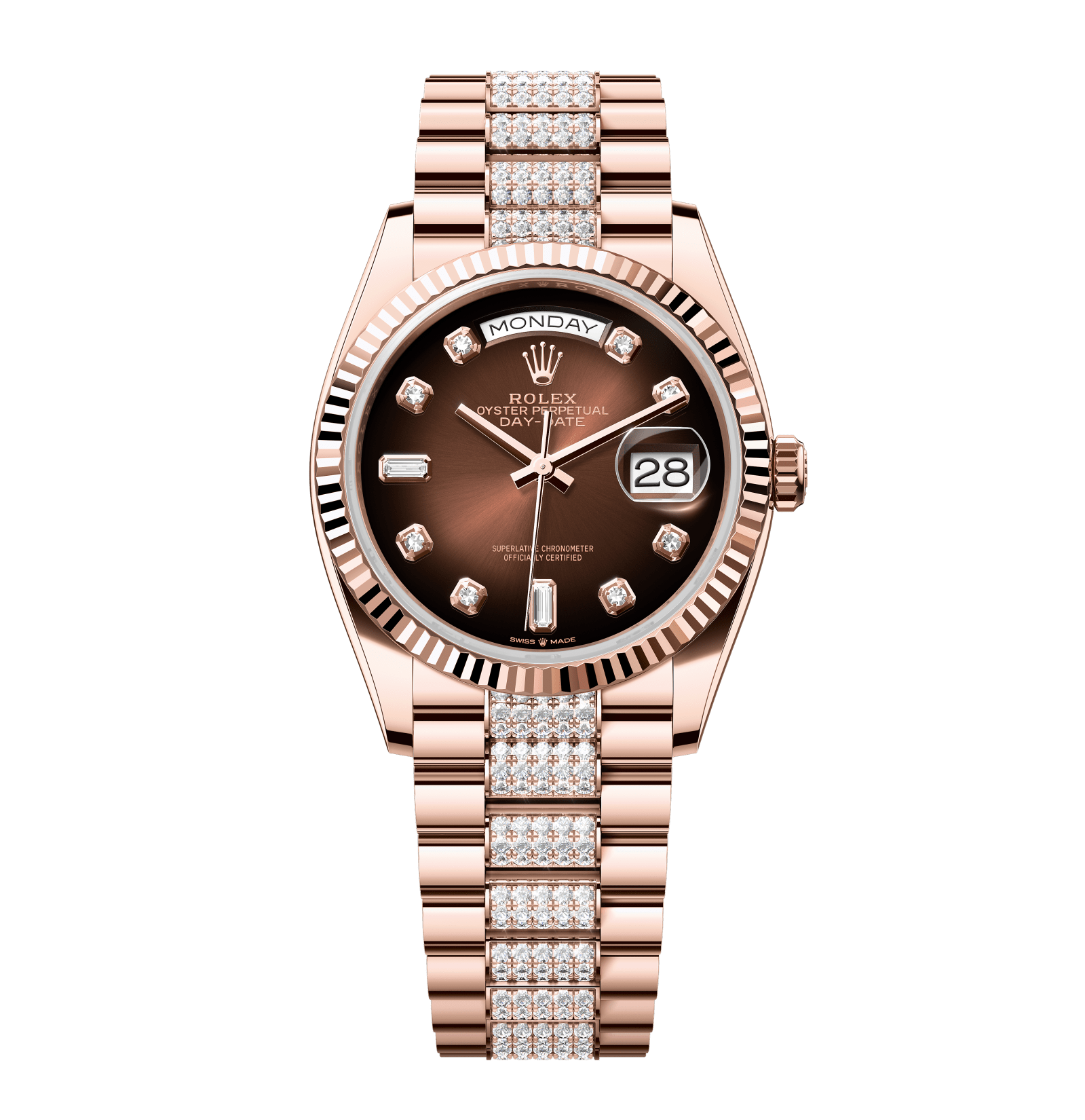 Rolex Day-Date – 36 mm – רוז גולד רצועת יהלומים באזל משונן לוח שוקולד יהלומים גימור שוויצרי