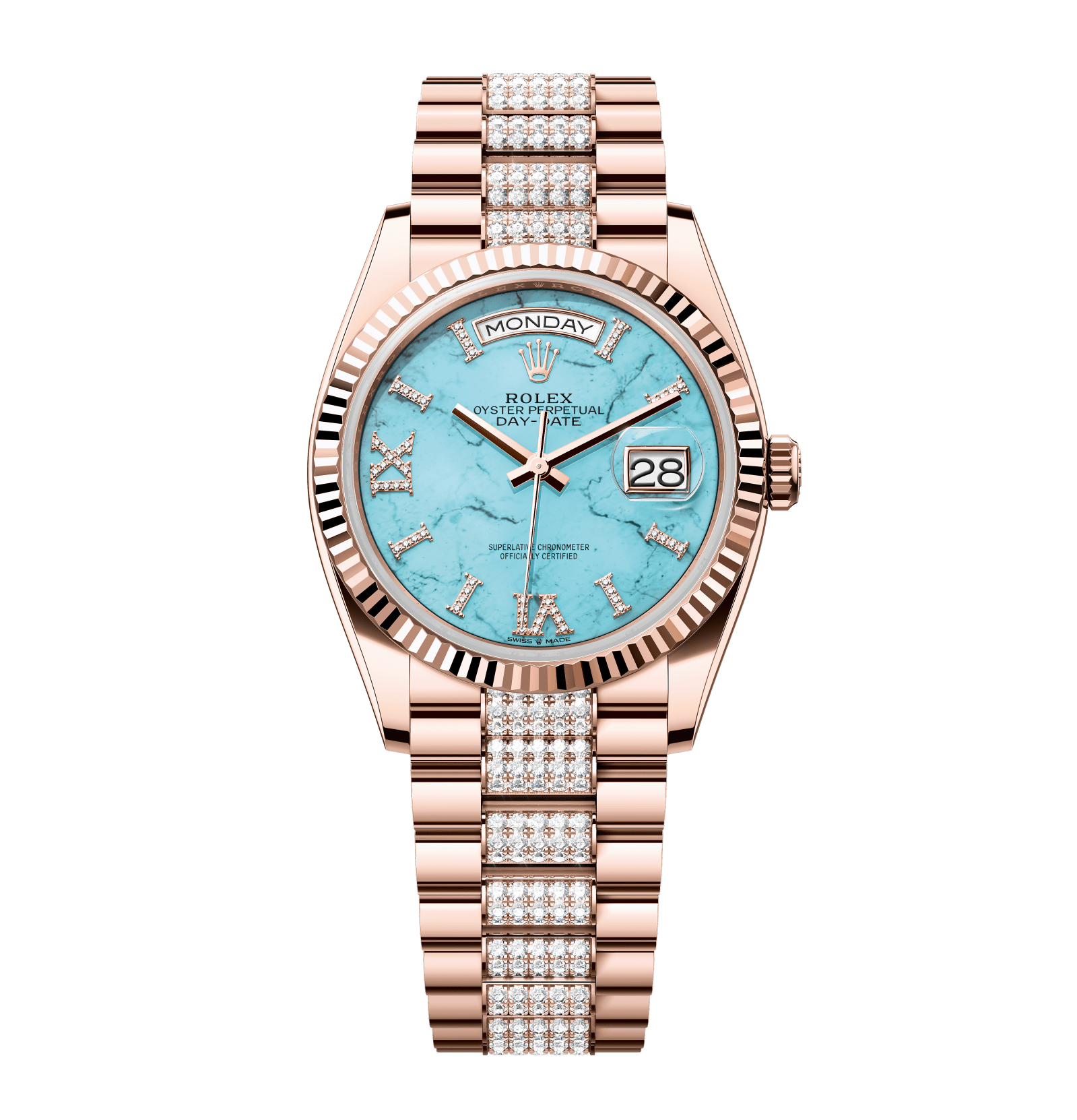 Rolex Day-Date – 36 mm – רוז גולד רצועת יהלומים באזל משונן לוח רומי תכלת גימור קצה