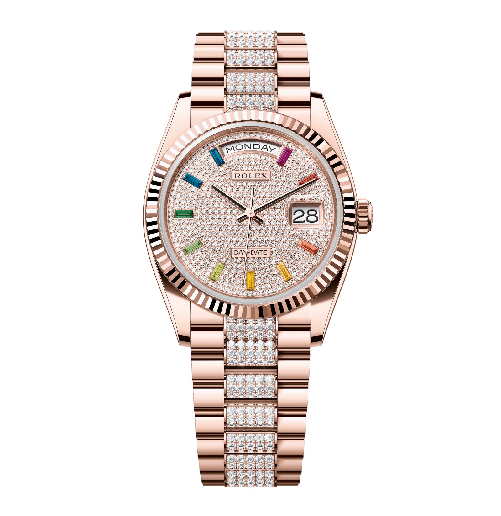 Rolex Day-Date – 36 mm – רוז גולד רצועת יהלומים באזל משונן לוח יהלומים קשת בענן גימור קצה