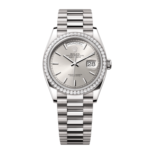 Rolex Day-Date – 36 mm – זהב לבן רצועת ג'ובילי באזל יהלומים לוח סילבר