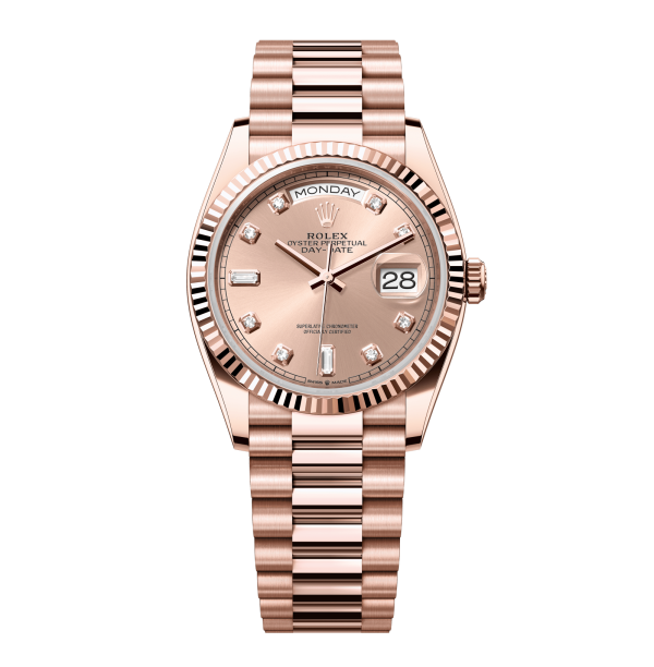 Rolex Day-Date – 36 mm – רוז גולד רצועת יהלומים באזל משונן לוח רומי ירוק אוונטורין