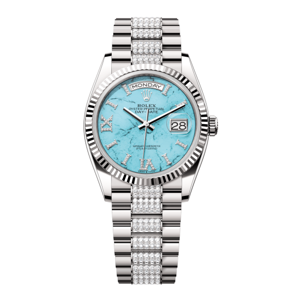 Rolex Day-Date – 36 mm – זהב לבן רצועת יהלומים באזל משונן לוח רומי תכלת