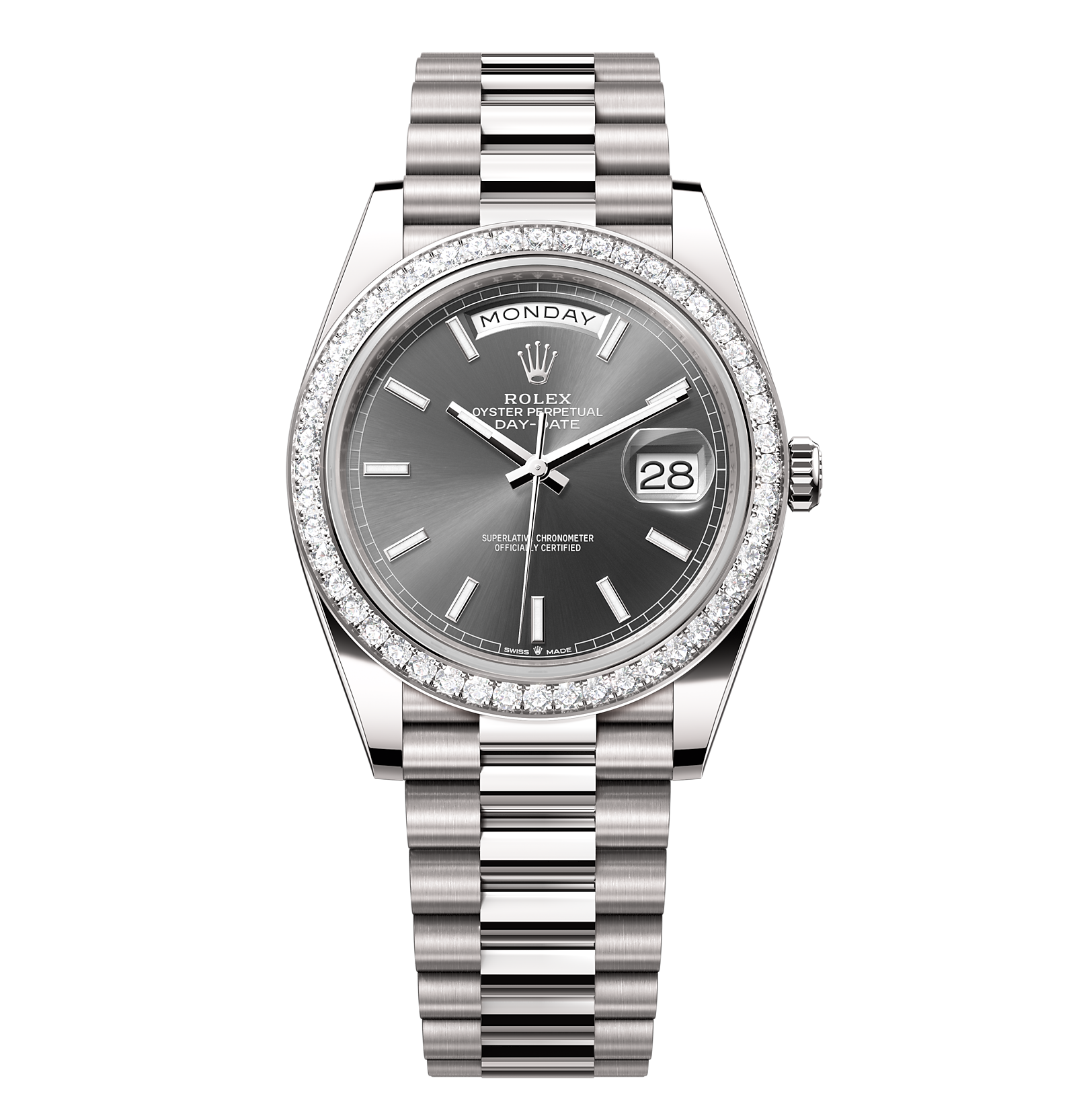 Rolex Day-Date – 40 mm – זהב לבן לוח אפור כהה באזל יהלומים גימור שוויצרי