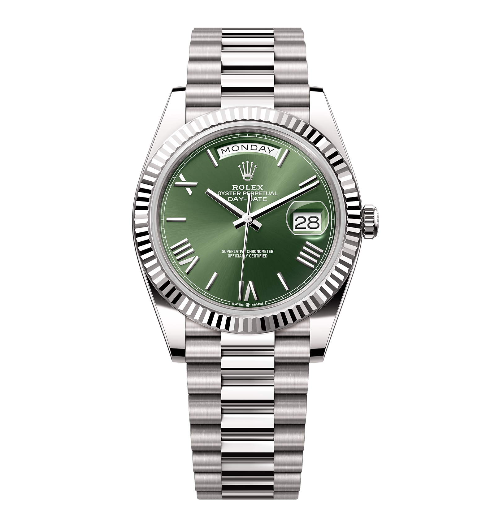 Rolex Day-Date – 40 mm – זהב לבן לוח ירוק רומי גימור שוויצרי