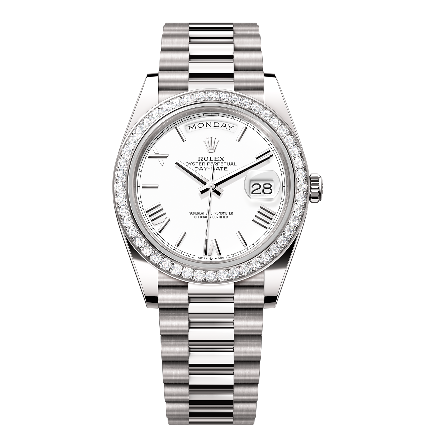Rolex Day-Date – 40 mm – זהב לבן לוח לבן רומי באזל יהלומים גימור שוויצרי