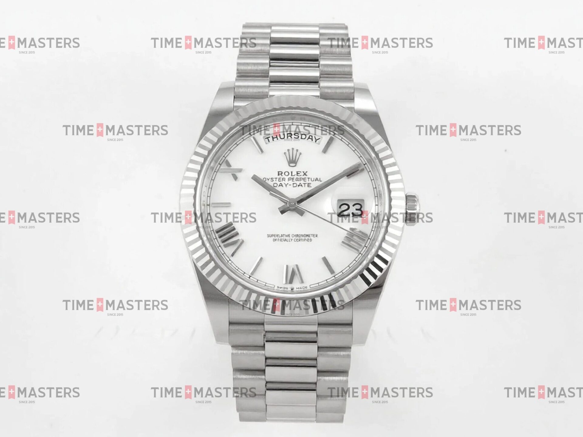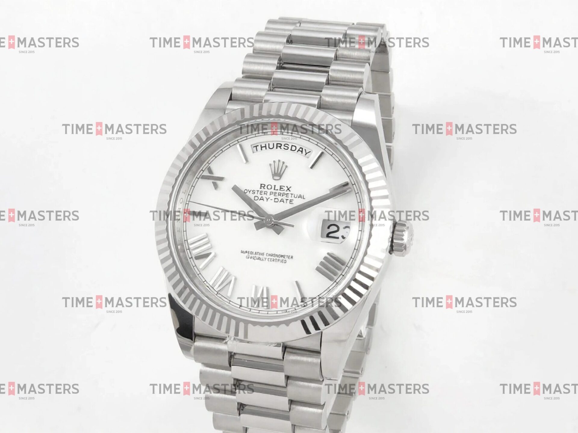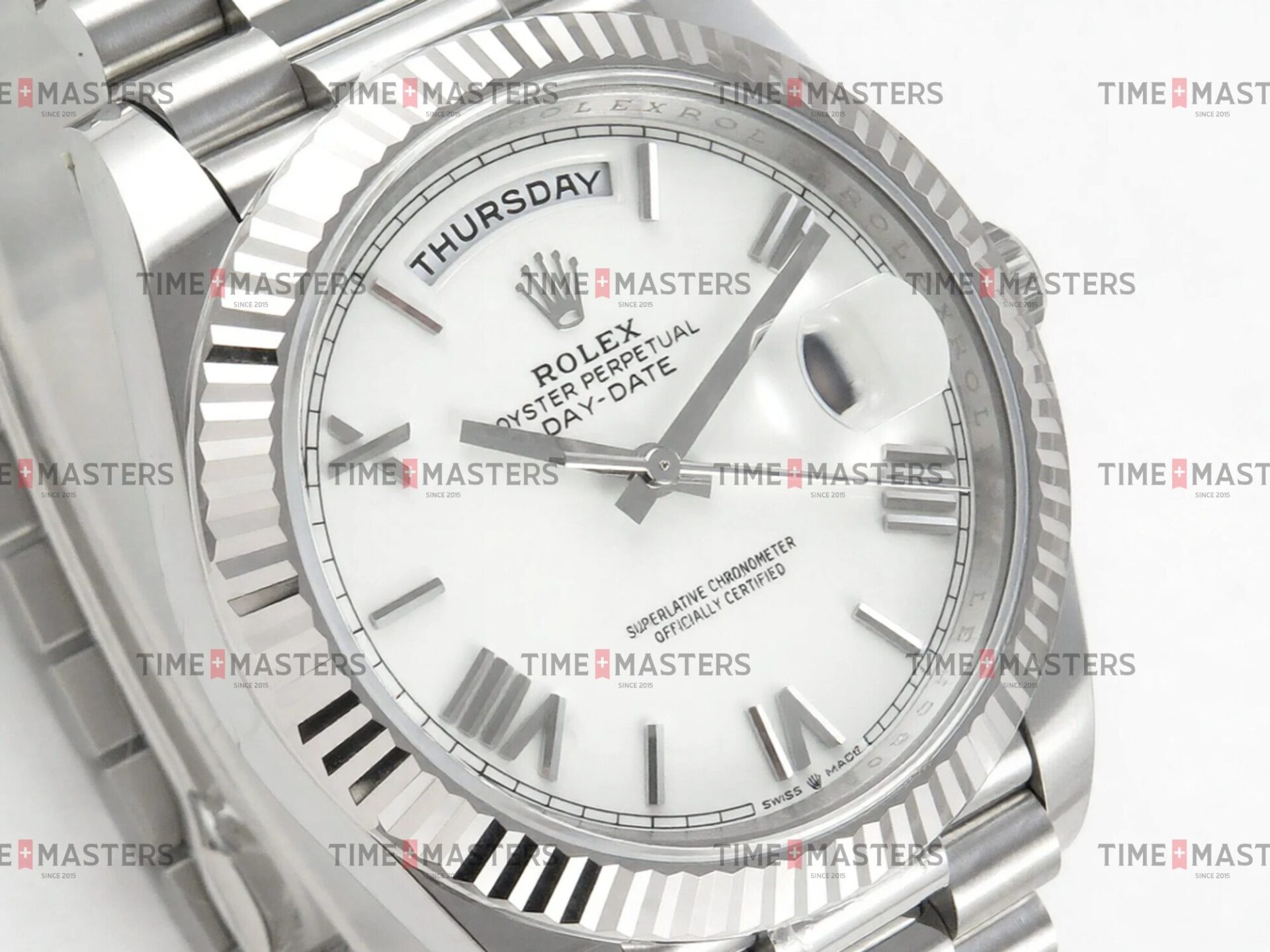 Rolex Day-Date – 40 mm – זהב לבן לוח לבן רומי גימור קצה
