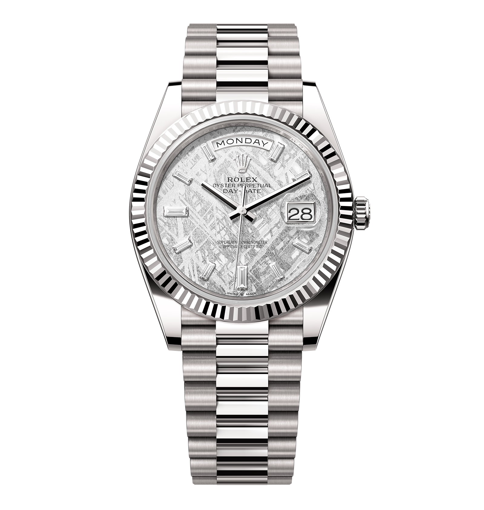 Rolex Day-Date – 40 mm – זהב לבן לוח מטאור יהלומים גימור שוויצרי