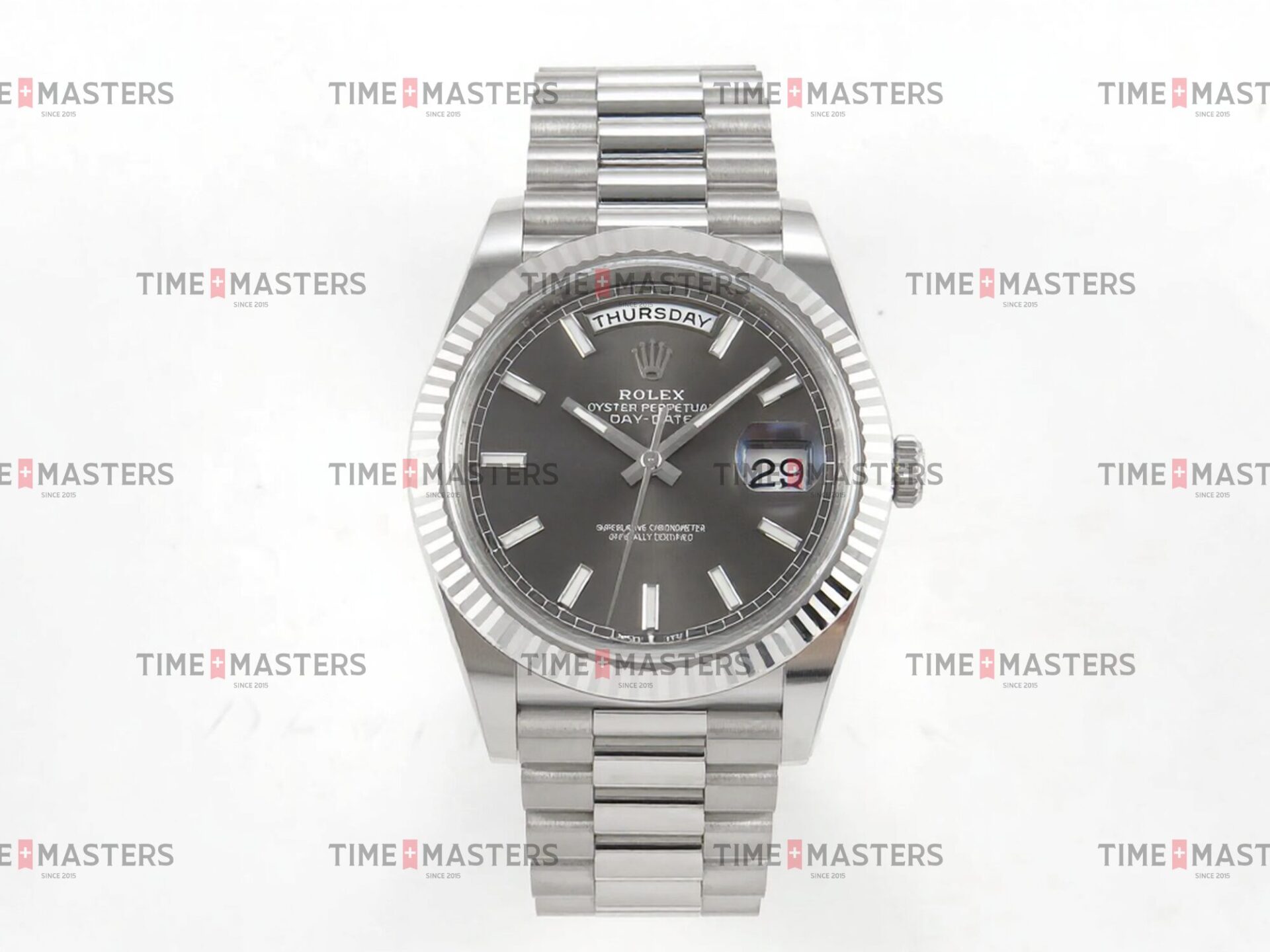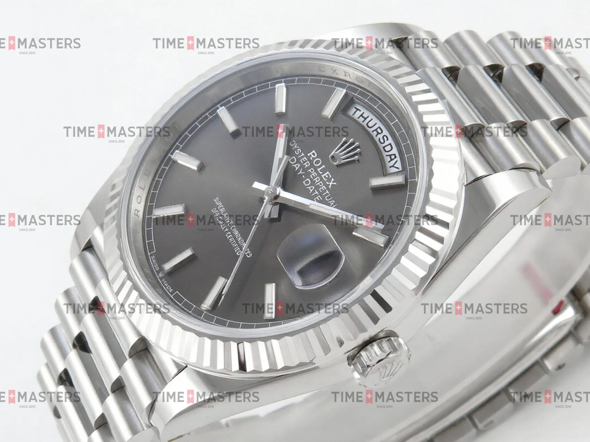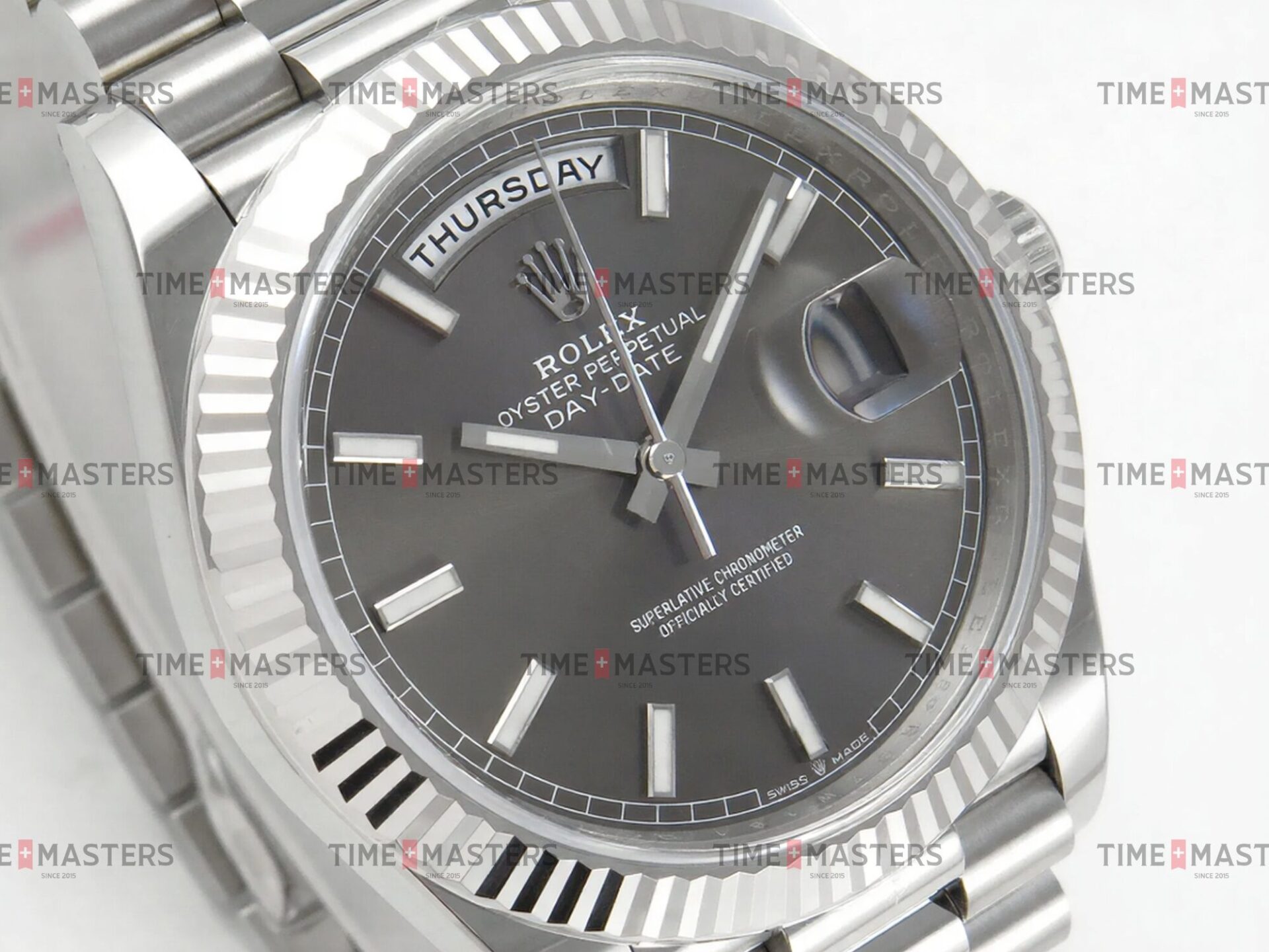 Rolex Day-Date – 40 mm – זהב לבן לוח שחור גימור קצה
