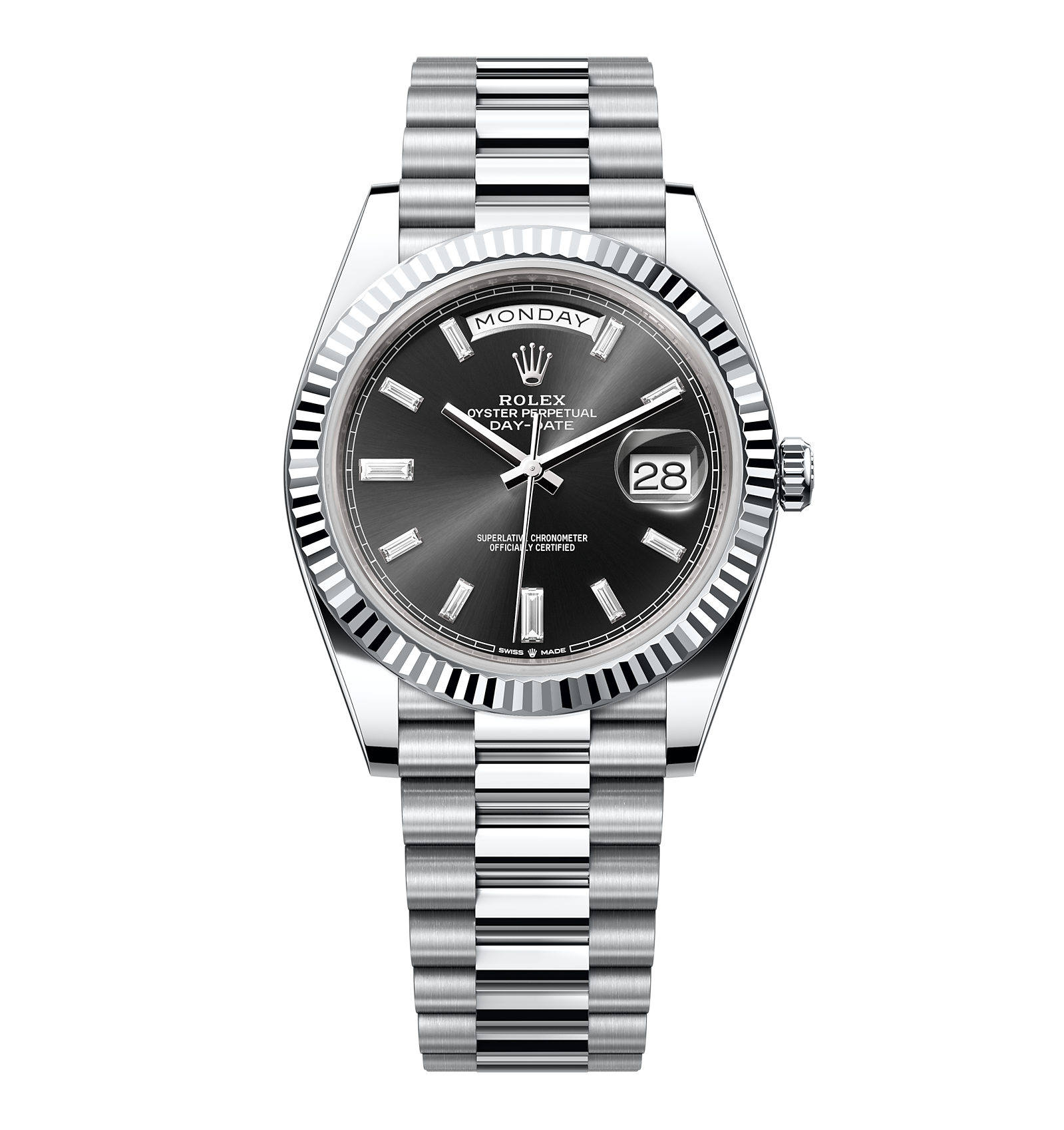 Rolex Day-Date – 40 mm – זהב לבן לוח שחור יהלומים גימור שוויצרי